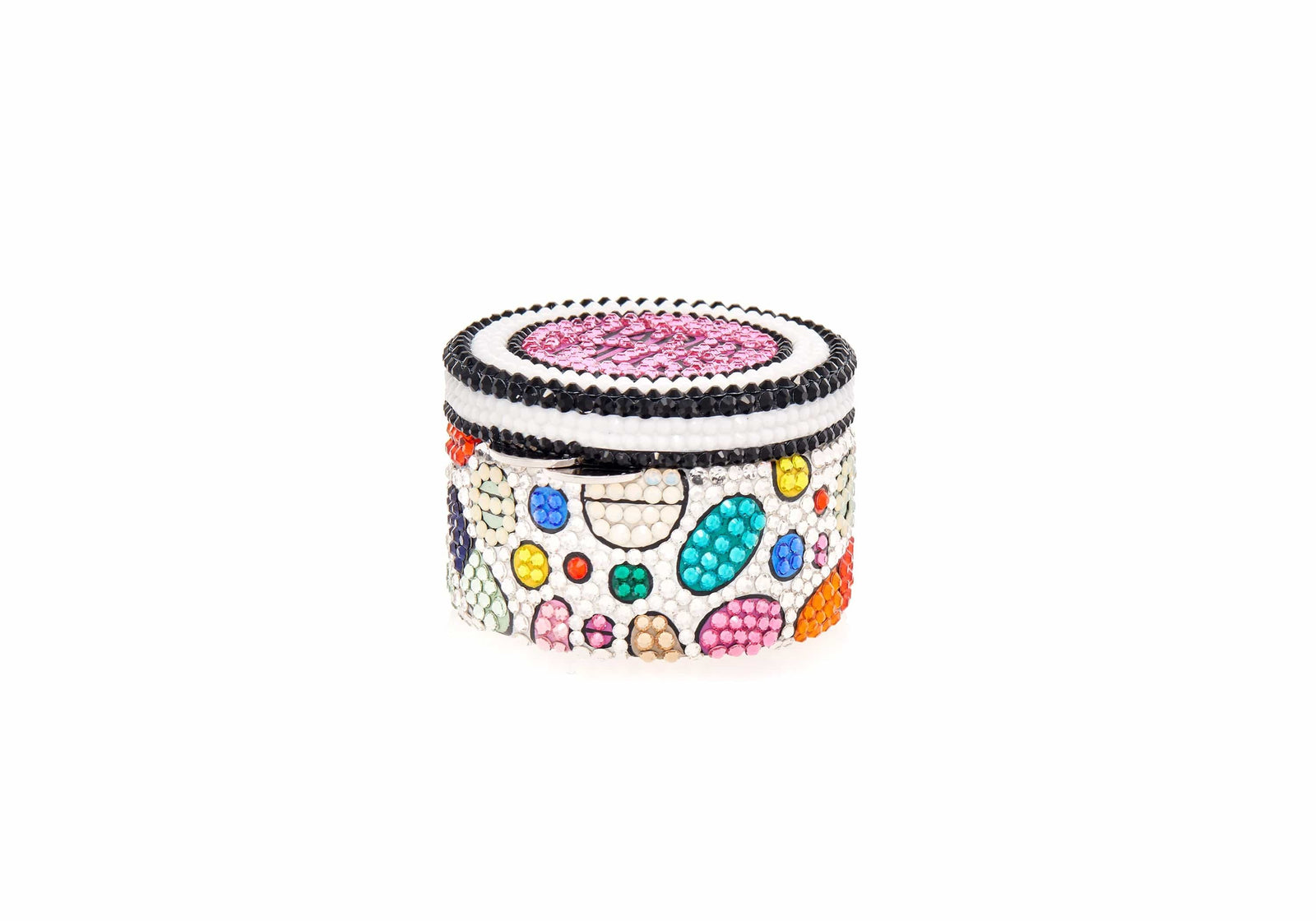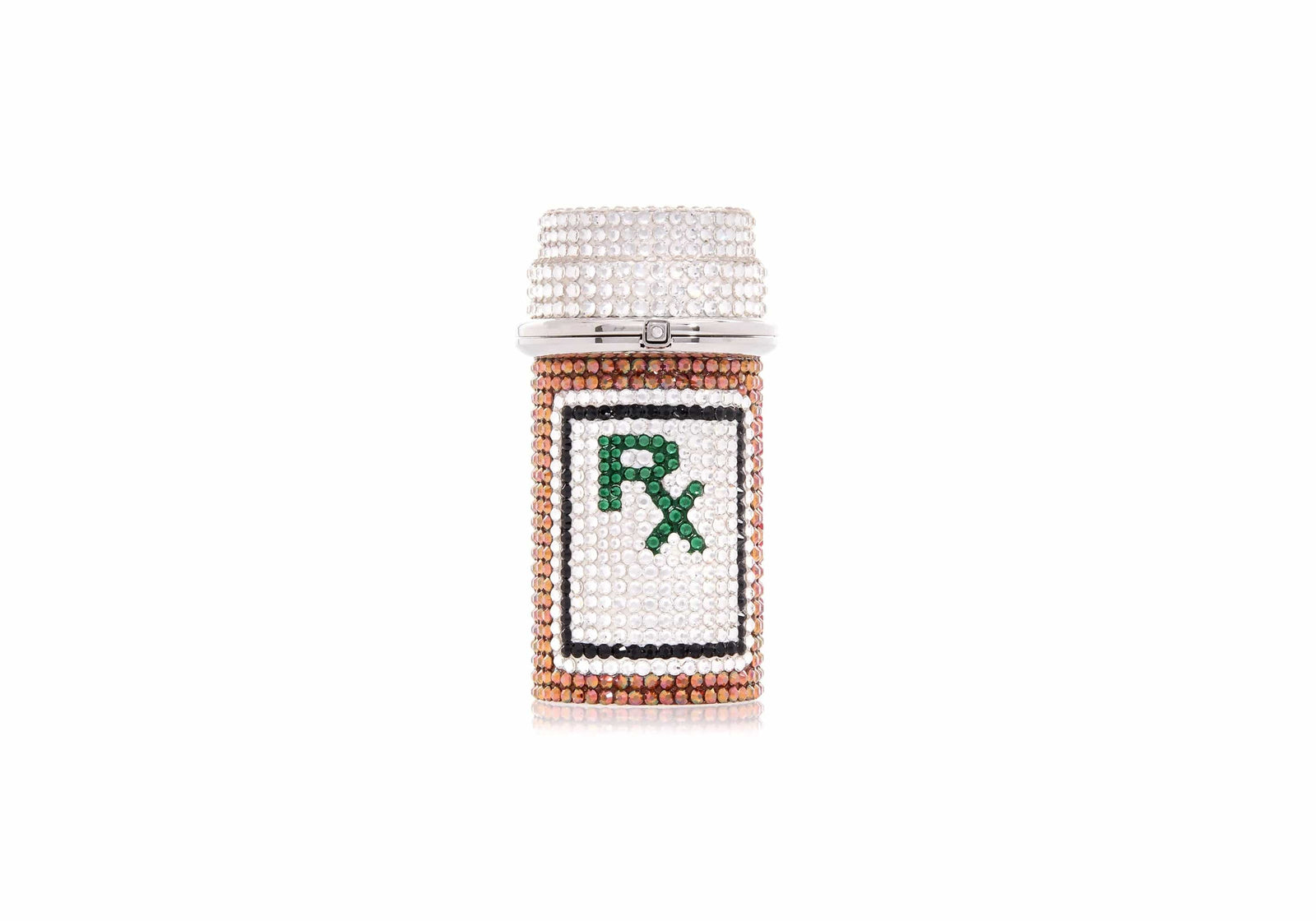 Love is a drug worth taking. Our miniature prescription bottle is adorned with colorful crystals in a pattern covered with candy heart “love pills”.