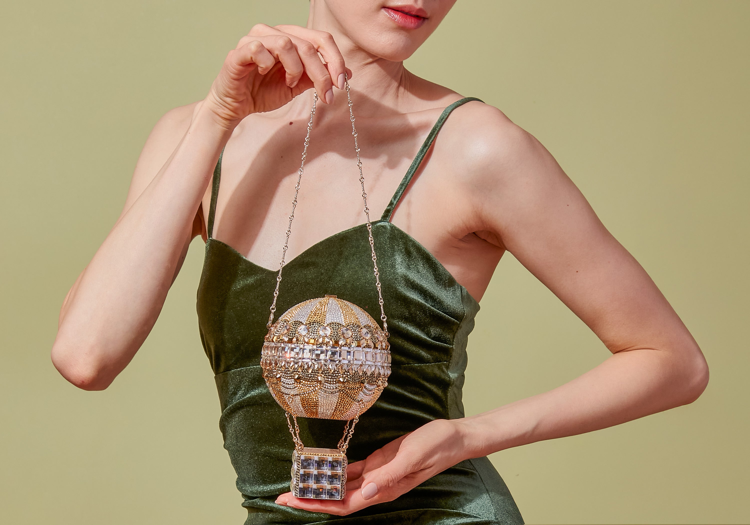 Behold the neutral rendition of a Judith Leiber Favorite, this Rozier Hot Air Balloon Gold crystal clutch, showcasing a unique design highlighted by antique gold and silver striped crystal-striped balloon. The oversized crystal border and opulent gold-plated basket elevate this accessory into a dreamy carriage for your evening essentials, adding a touch of imagination and glamour to your ensemble.