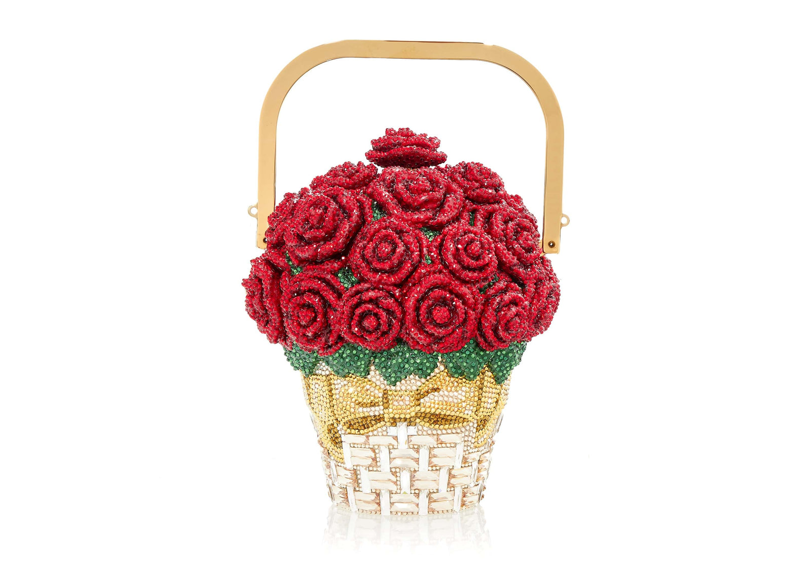 In a sea of blossoms, the Judith Leiber Rose American Beauty reigns—a solitary bloom, unfolded, fierce, and unyielding. A true floral masterpiece, this resplendent rose-shaped clutch flawlessly echoes the enchanting grace of the cosmos' beloved crimson flower. It invites you to discover its artistry, where radiant Siam crystals are set with remarkable precision. As you open the bag, a gleaming metallic interior reveals itself, embraced by soft leather. The precious red rose clutch bag makes a striking statement, whether carried on a romantic date, a chic brunch, or a glamorous red-carpet event.