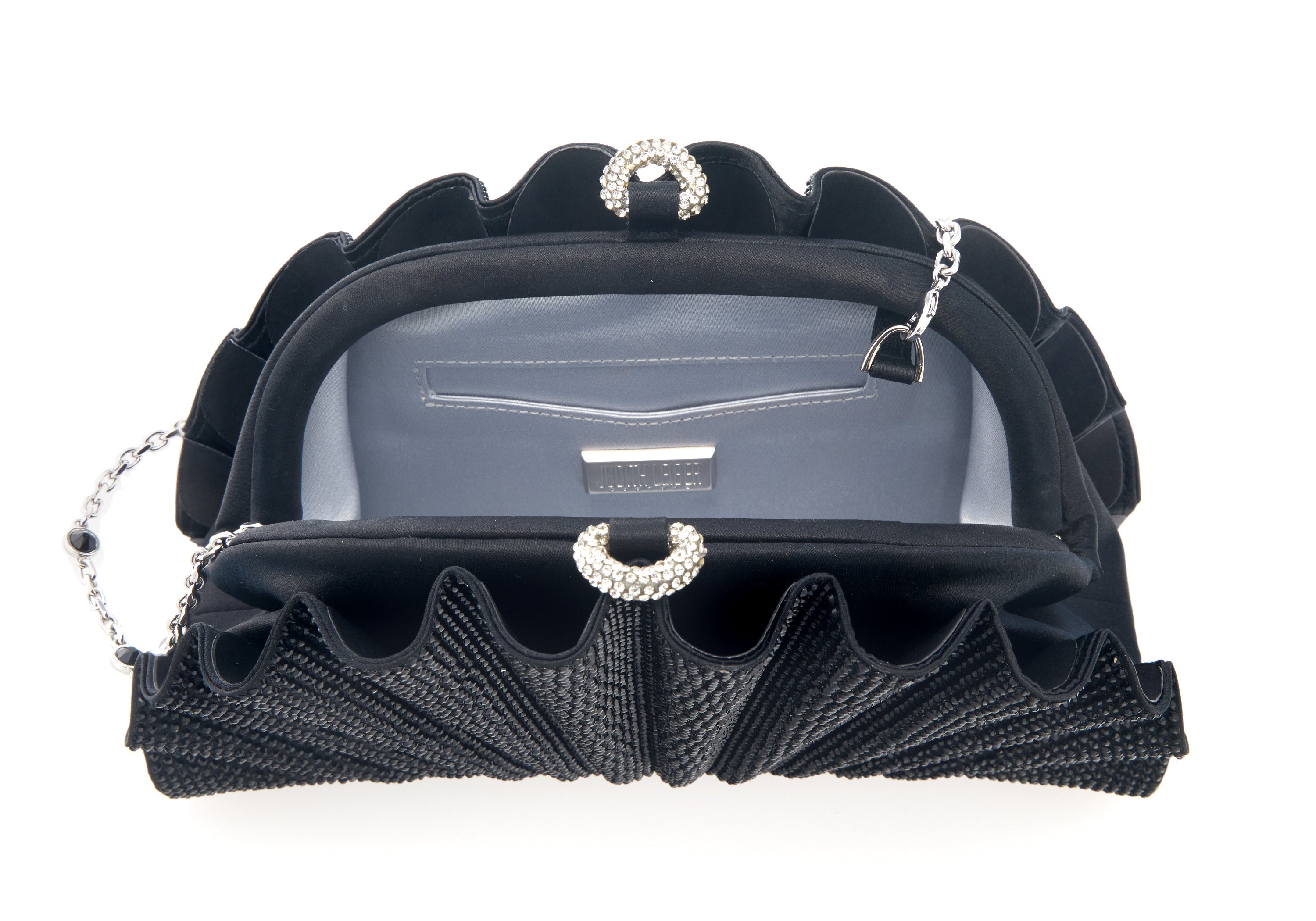 Step into refined elegance with the Black Origami Fan Crystal Clutch, a striking accessory that combines bold design with versatile functionality. Covered in black crystals, the bag’s elegant, scalloped shape adds a sophisticated touch of glamour to any look. The soft magnetic closure ensures both convenience and seamless style, while the capacity allows you to carry your essentials with ease. Ideal for both evening soirées and chic day-to-night wear, this handbag perfectly balances luxury, practicality, and timeless allure.