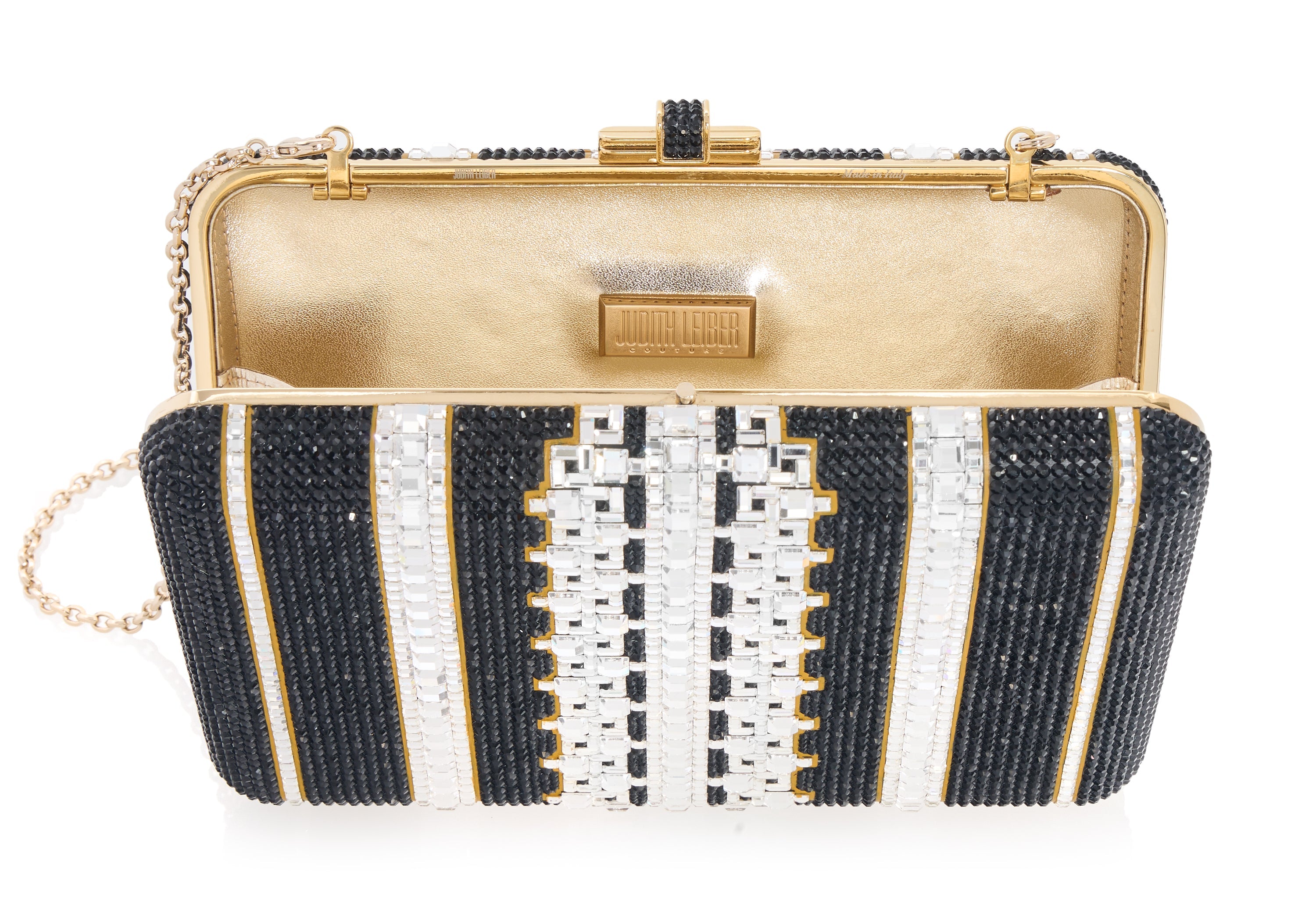 There’s something hypnotic about symmetry done right—and the Judith Leiber Slim Slide Crystal Lattice clutch proves that structure can be liberating. Draped in black crystals, its sleek silhouette is punctuated by a line of silvery, bold baguette-cut stones—a luminous spine of order amid the dark shimmer. The gold-toned hardware adds warm contrast, offsetting the clutch’s architectural precision with a touch of vintage inspired glam. The Judith Leiber Slim Slide Crystal Lattice clutch is versatile and understated—making moments memorable on its own terms.
