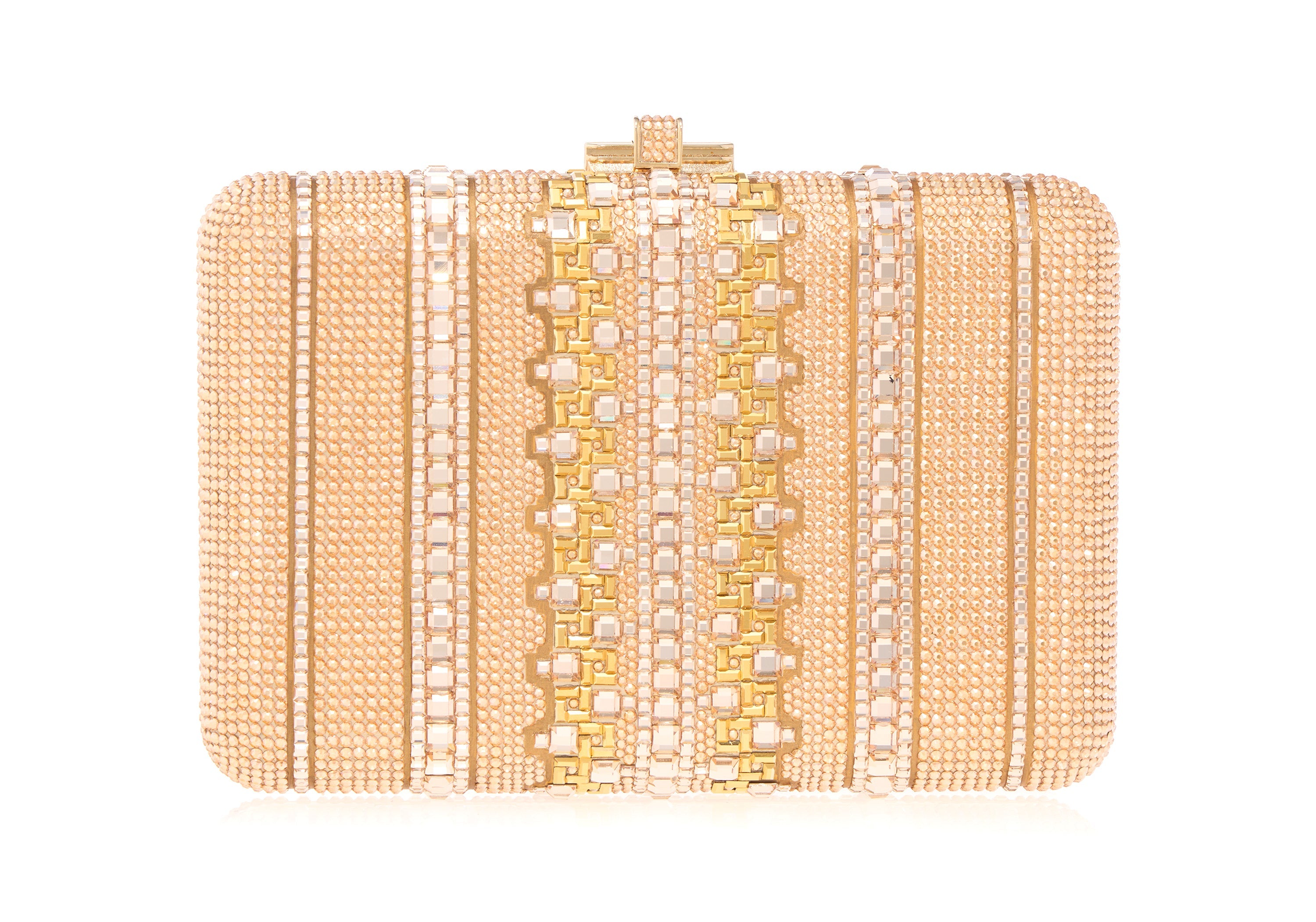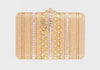 Effortlessly elegant, the Slim Slide Crystal Lattice clutch captures the essence of refined luxury with a subtle sparkle that feels both modern and timeless. Set against a shimmering prosecco-toned crystal ground, this sleek clutch features a bracelet-inspired lattice pattern crafted from square and baguette-shaped crystals, creating a structured geometric design that evokes fine jewelry. Sophisticated yet statement-worthy, this piece is perfect for formal events, weddings, or any occasion where understated glamour takes center stage.