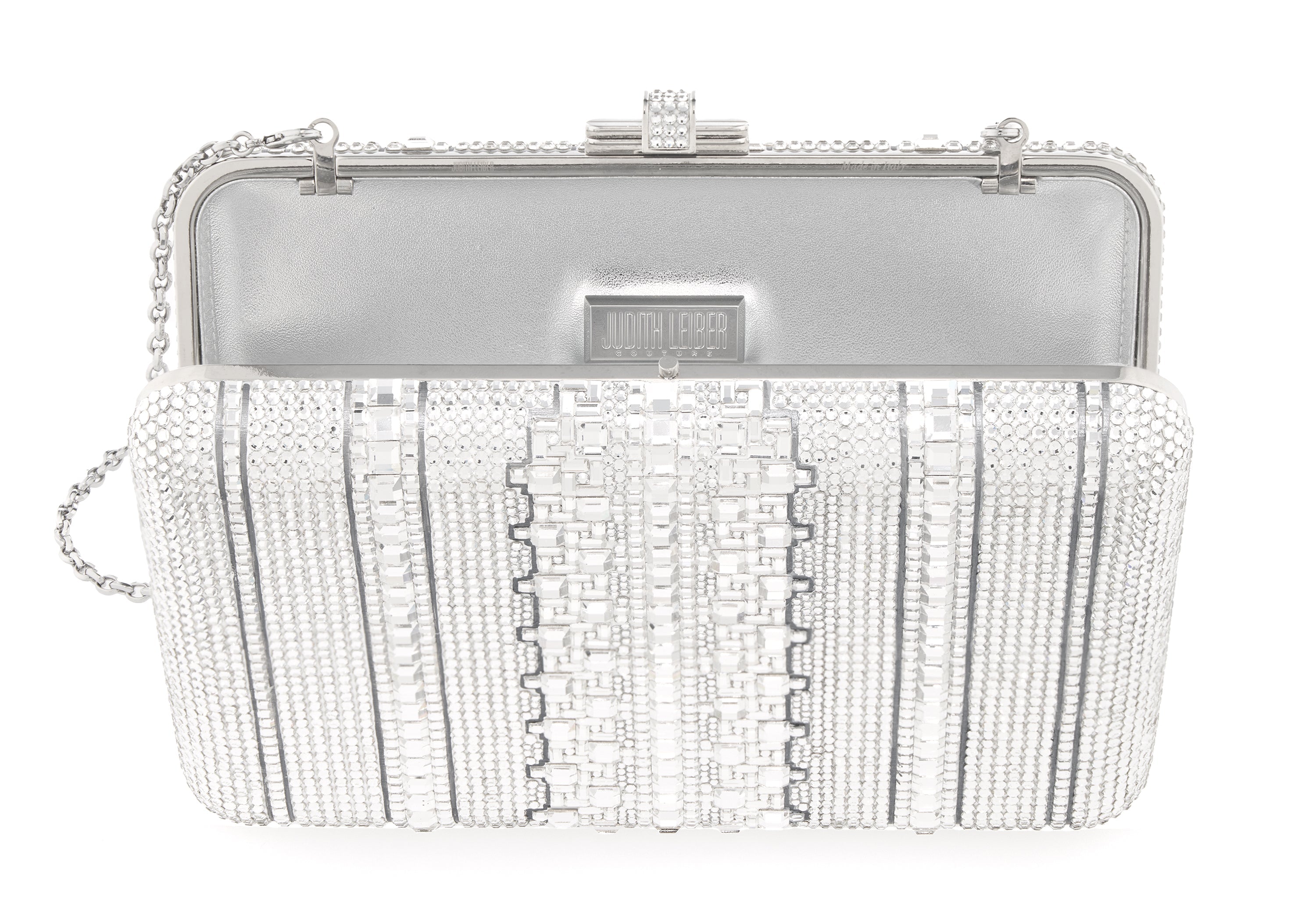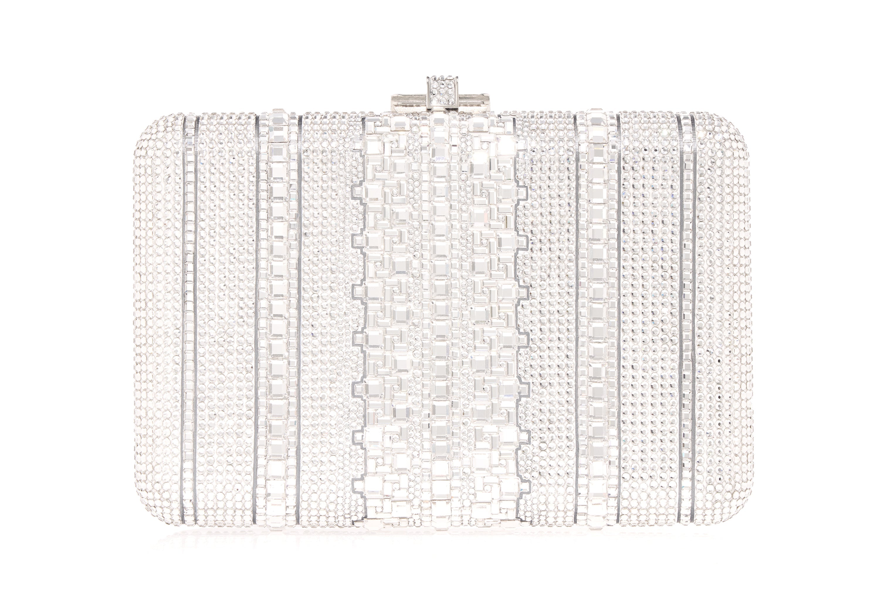 Sleek and sophisticated, the Slim Slide Crystal Lattice Clutch brings a modern edge to timeless evening style. Set against a radiant silver crystal ground, this elegant design features a bracelet-inspired lattice pattern made from square and baguette-shaped crystals, arranged in a crisp, geometric formation that echoes the brilliance of fine jewelry. With its clean lines and cool-toned shimmer, this clutch is a refined statement piece—perfect for black-tie events, galas, or any moment that calls for polished glamour.