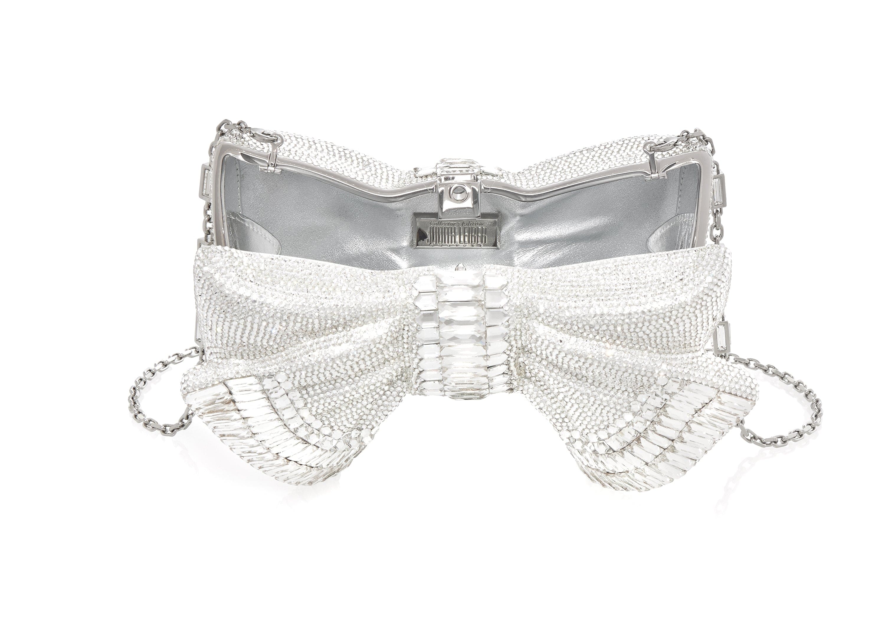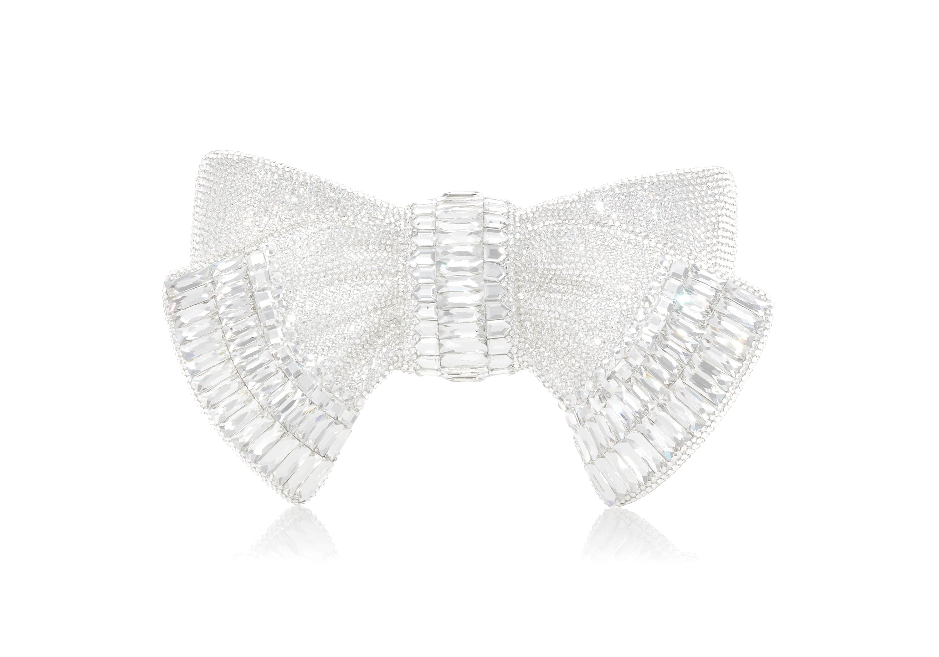 Exude enchanting glamour with our Bow Deco Gems crystal evening clutch, a dazzling embodiment of Art Deco elegance. The bow-shaped design, brilliantly sparkles with silver handset crystals and baguette crystal detailing and transforms every glance into a captivating masterpiece, ensuring you steal the spotlight at any event.