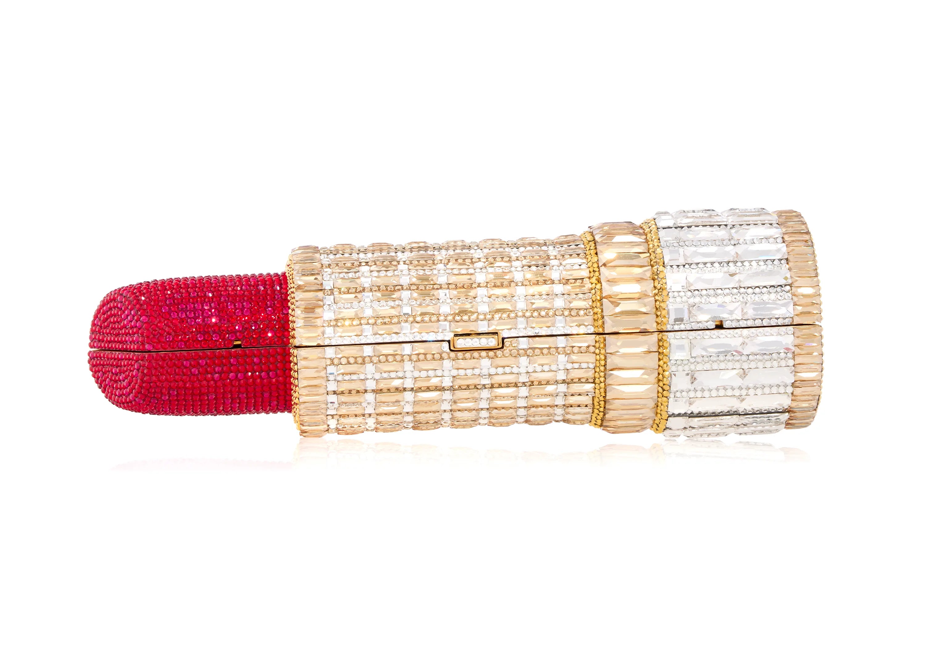 Reveal a masterstroke of opulent elegance with our Lipstick Seductress crystal clutch, a stunning handbag that effortlessly fuses haute fashion and playful beauty. With glistening gold baguette crystals at the base and crowned with a bold, ruby red tinted crystal tip that is reminiscent of your favorite lipstick, this clutch is always ready to make a striking fashion statement.