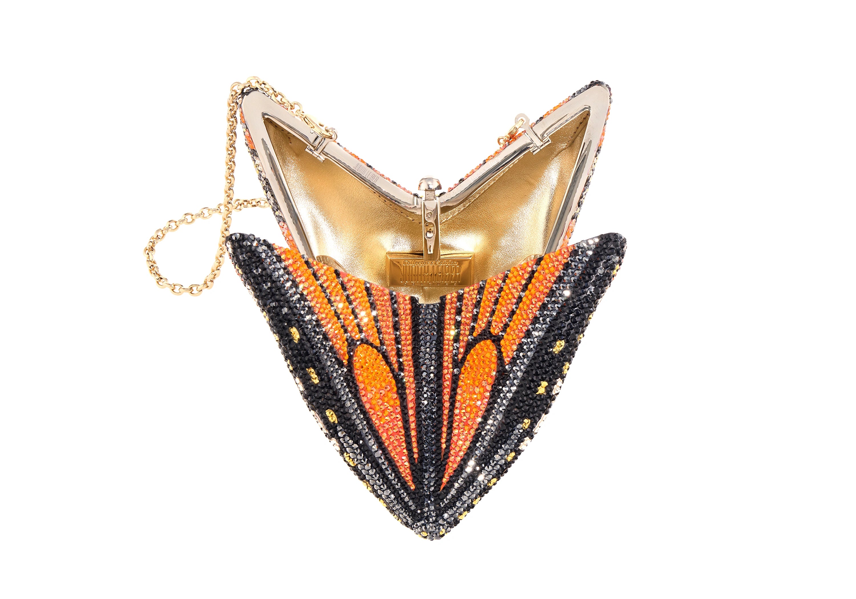Radiant and striking, the Butterfly Marigold clutch shines with crystals in warm bronze, golden topaz, and sunlit tones, contrasted by black accents that capture the beauty of a traditional Monarch butterfly. Handcrafted with exquisite attention to detail, this timeless design is a statement piece that celebrates both artistry and elegance.