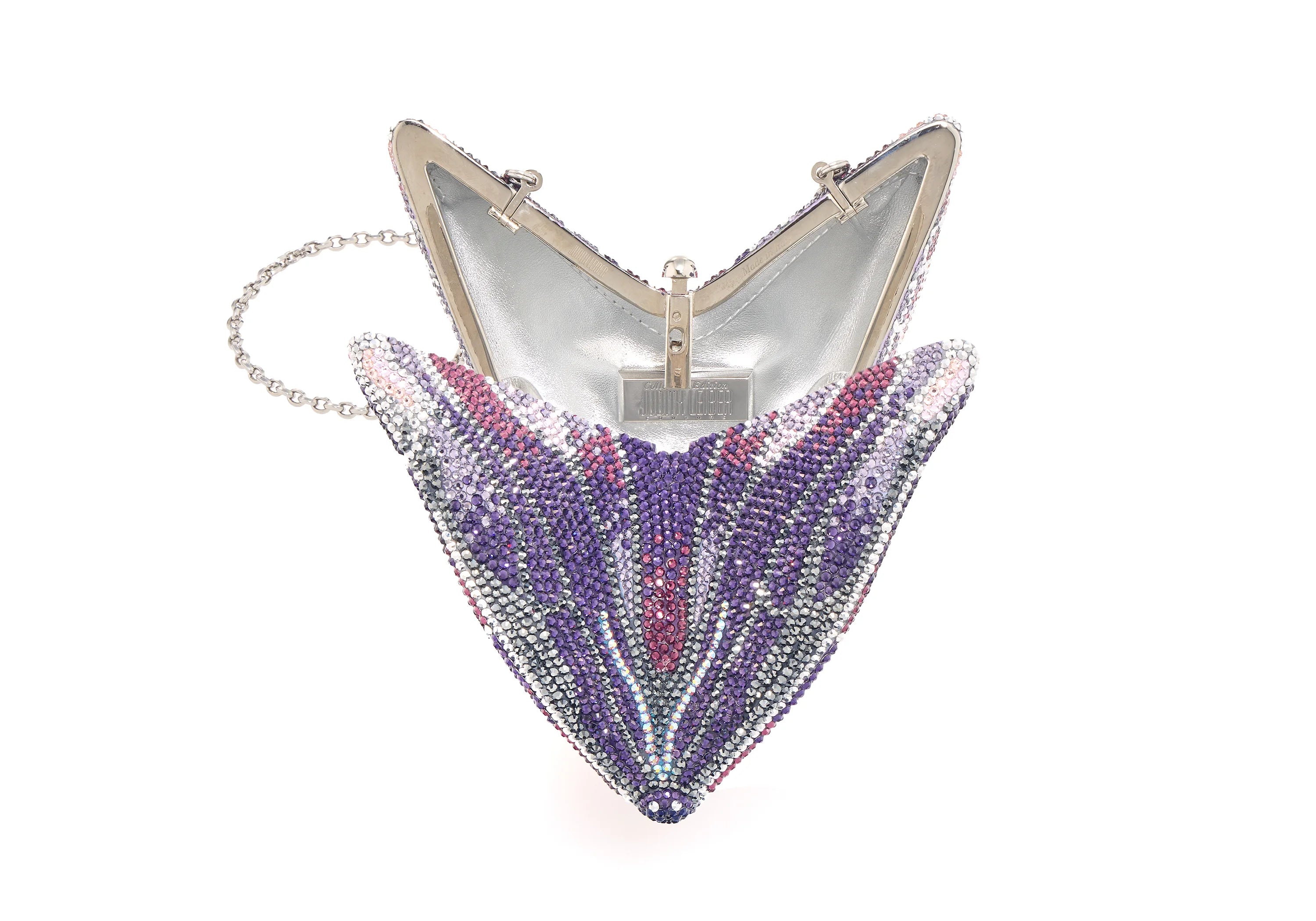 Graceful and enchanting, the Violette Butterfly Clutch shimmers with crystals in soft lavender, deep purple, and a delicate dégradé of light violet tones, seamlessly blending artistry with timeless elegance. Perfect for special occasions, from a spring wedding to a garden party, this handcrafted masterpiece is more than a handbag; it is a collectible work of wearable art.