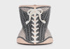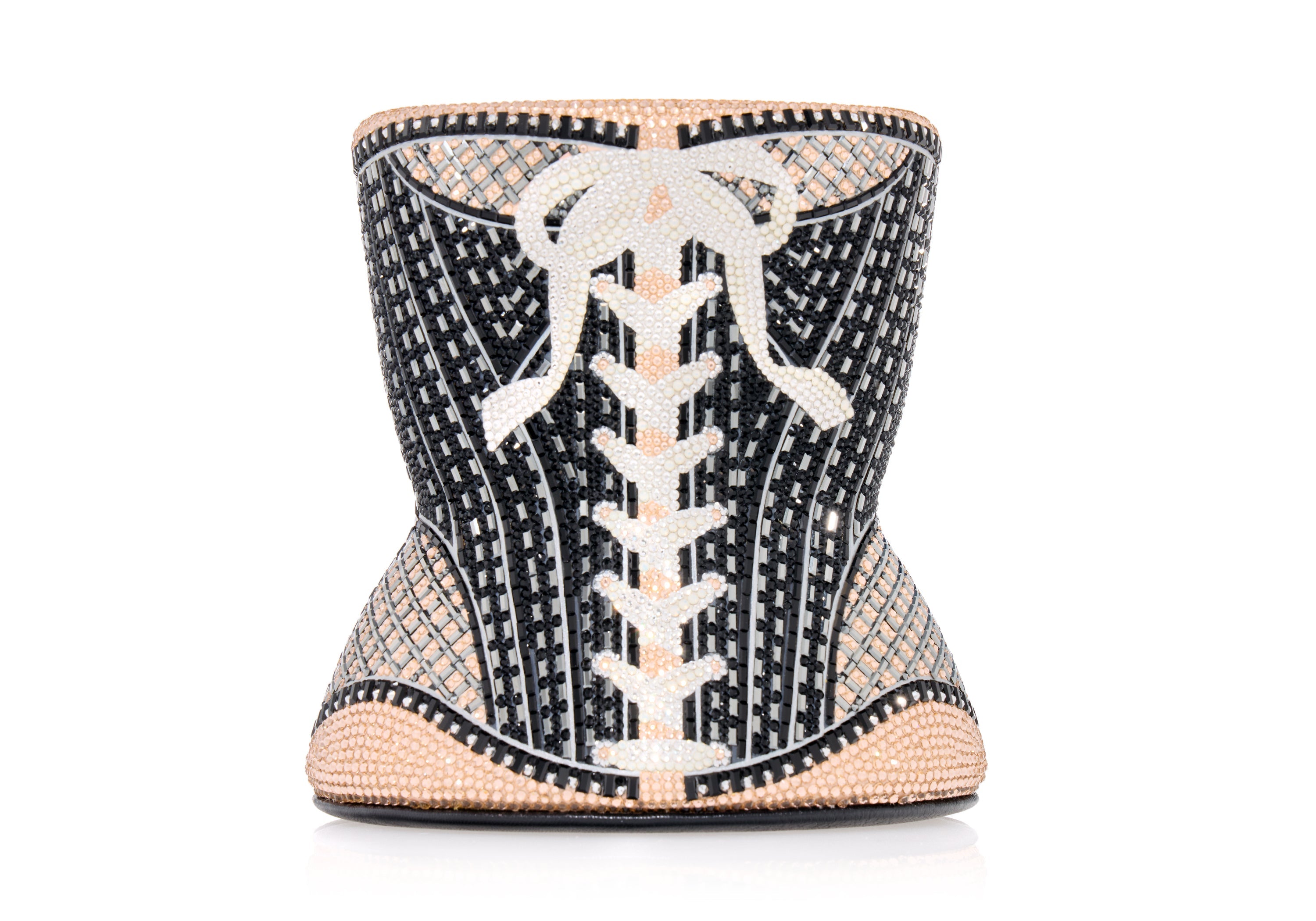Step into elegance with this bold yet refined Contour corset-shaped clutch, fully embellished in black crystals and finished with soft opal and nude accents. Intricate baguette crystal detailing and a romantic lace-up front with tied top evoke the look of a hand-laced corset, while laced edges add a couture-inspired finish. Designed for high-impact moments, this sparkling handbag is the ultimate statement for evening wear.