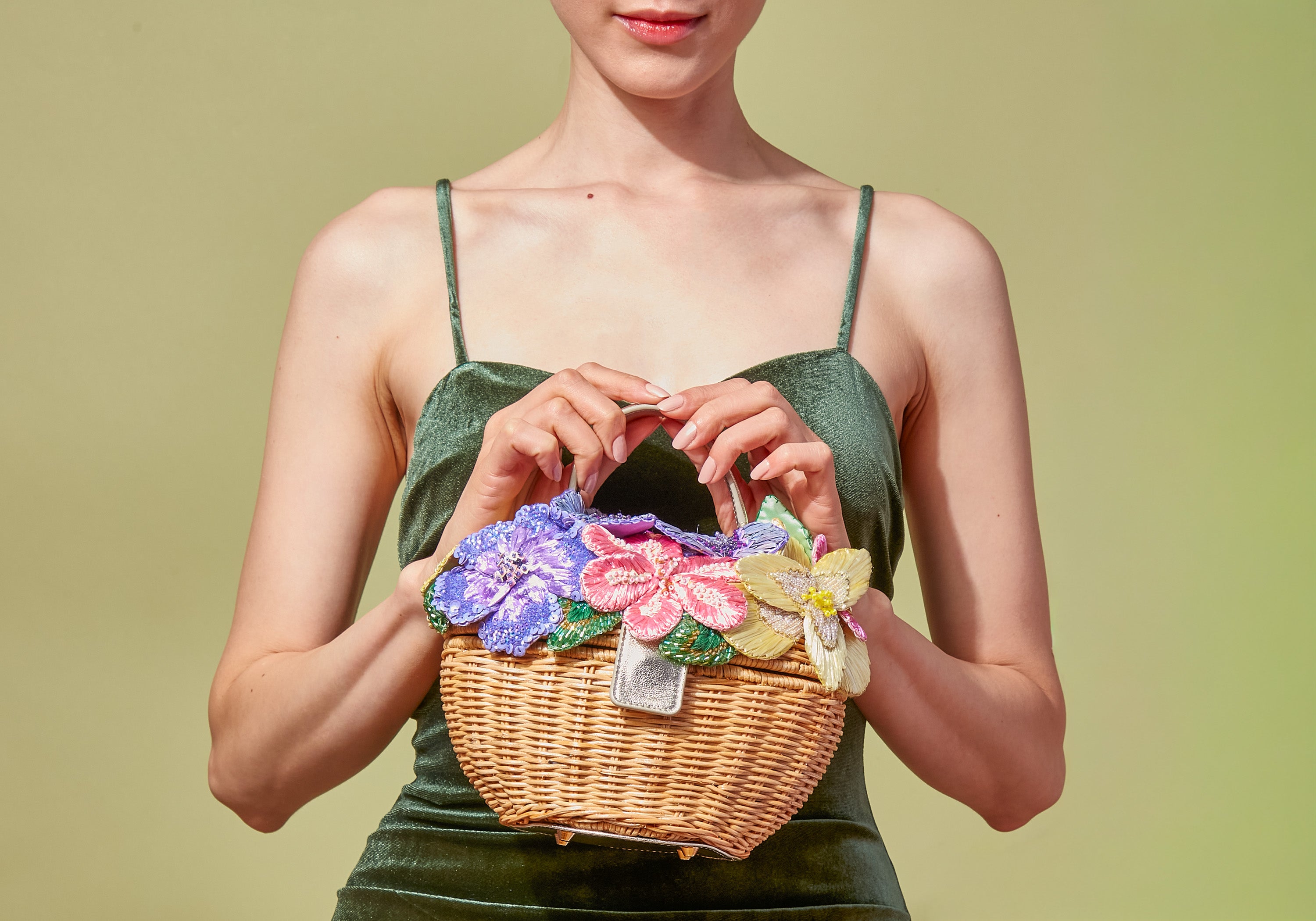 A blooming ode to the classic wicker basket, our Dorothy Basket Flower Bouquet Natural purse is effortlessly charming and overflowing with the season’s sweetest blossoms. The embroidered florals, crafted from raffia, paillettes, and seed beads, are scattered artfully with a loose, natural feel, as flowers gathered on the way to somewhere enchanting. Champagne-toned hardware and a leather top handle maintain a clean, elegant profile, while the microsuede-lined interior adds a subtle, indulgent touch. This chic accessory is designed to win sweet spots on guest lists for lively daytime events and occasions that extend into the evening.