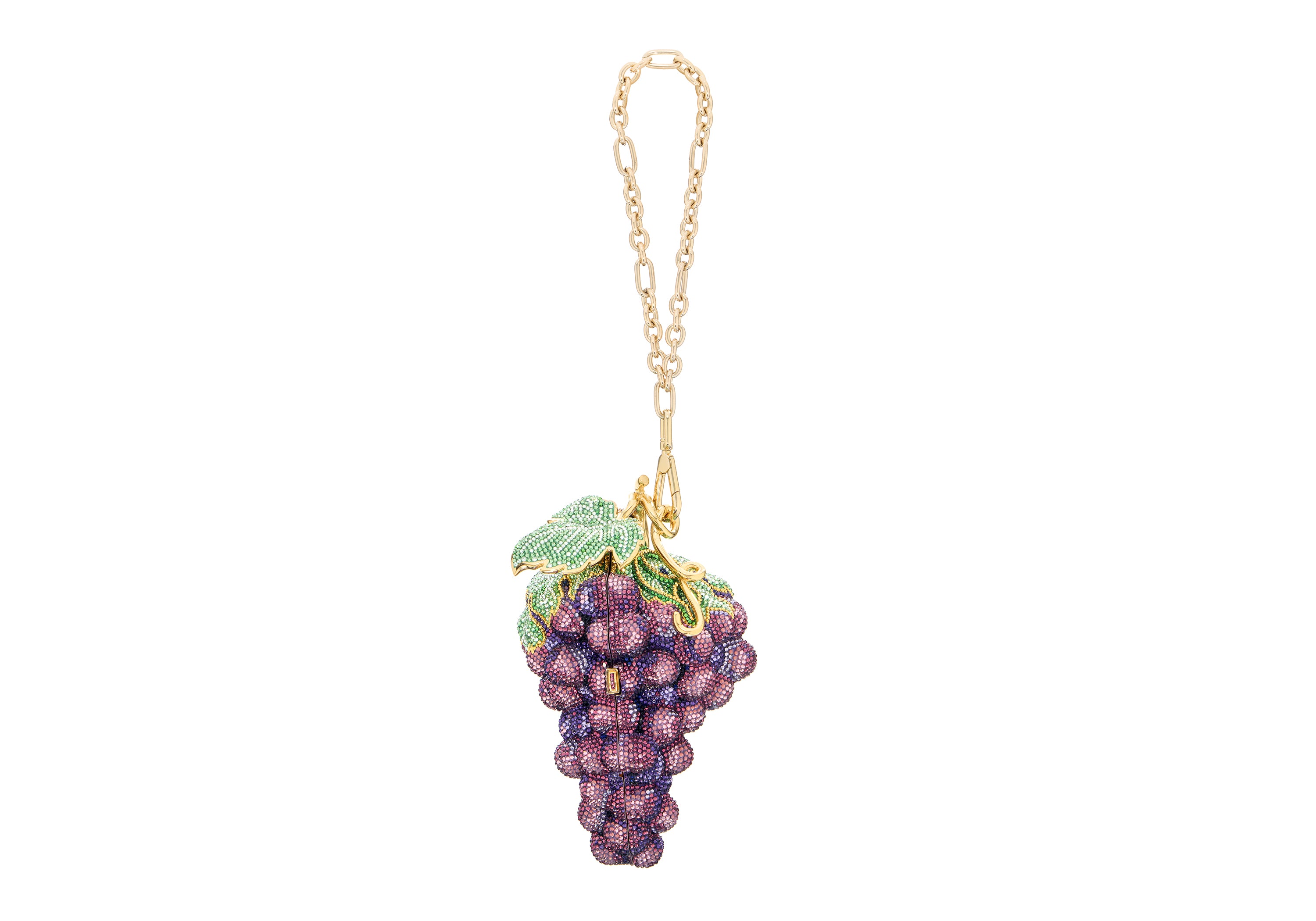 A vintage Judith Leiber design, the Grapes Concord clutch is a dazzling statement in rich shades of purple and amethyst and is finished with a green leaf detail and gold hardware. The bold and playful silhouette makes this bag an instant conversation starter, perfect for evenings out or anytime you want to add a fun twist to your style. With its secure closure and chic wristlet, this piece embodies craftsmanship and artistry in every detail.