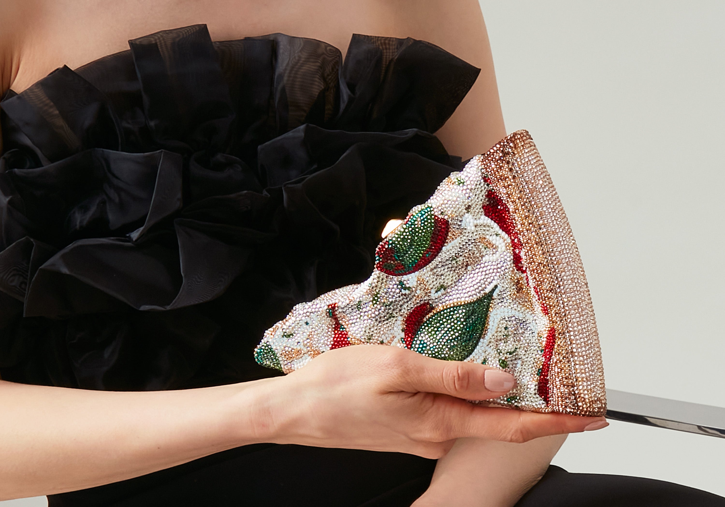An icon of Italian culture, this Pizza Margherita handbag is the ultimate pizza lover's dream. With handset crystals that create the look of melted cheese and fresh green basil leaves against a vibrant red tomato sauce and a perfectly toasted crust, this piece is a true conversation starter. Crafted in Italy to guarantee the perfect slice, this handbag is a blend of food and fashion in its most delicious form. Carry this clutch to a dinner with friends and add a pop of pure joy to your collection.