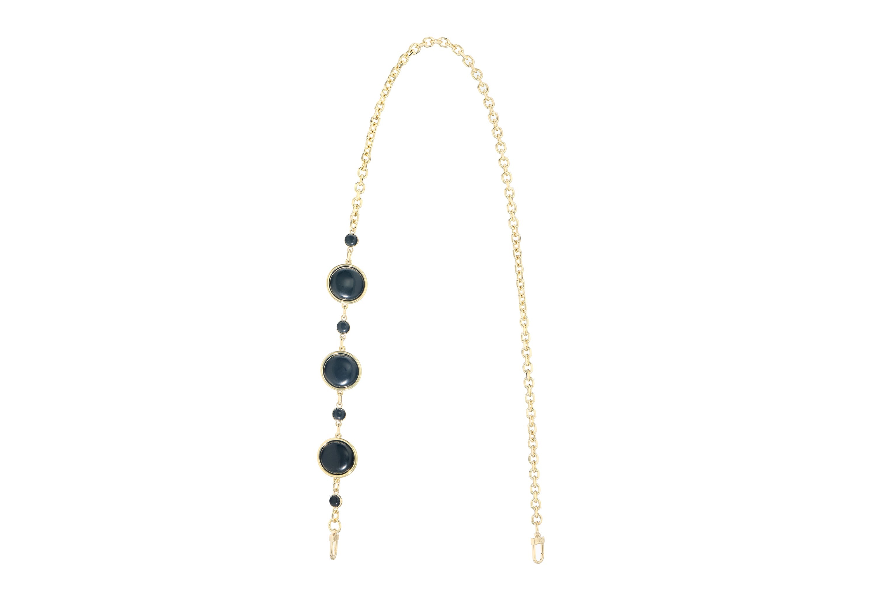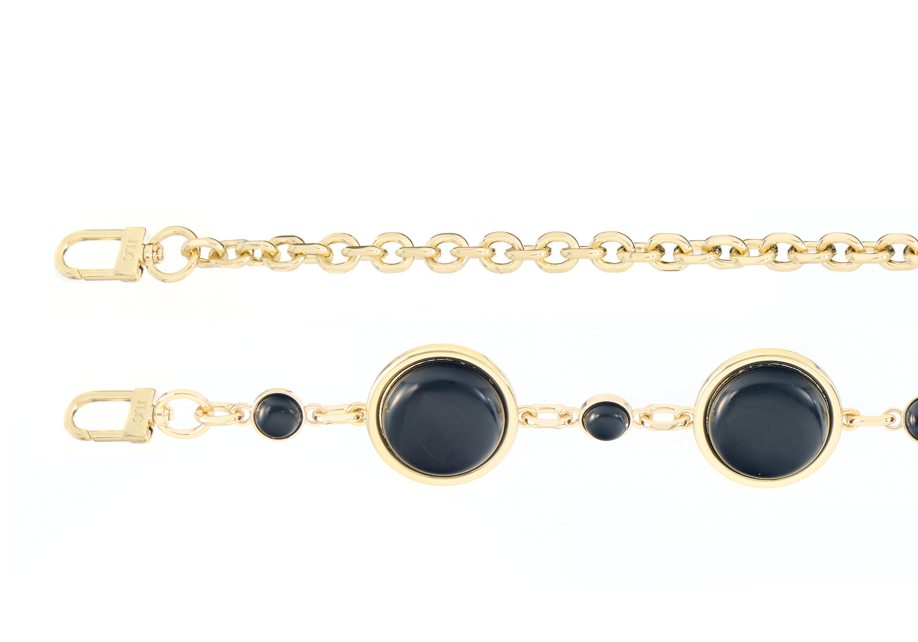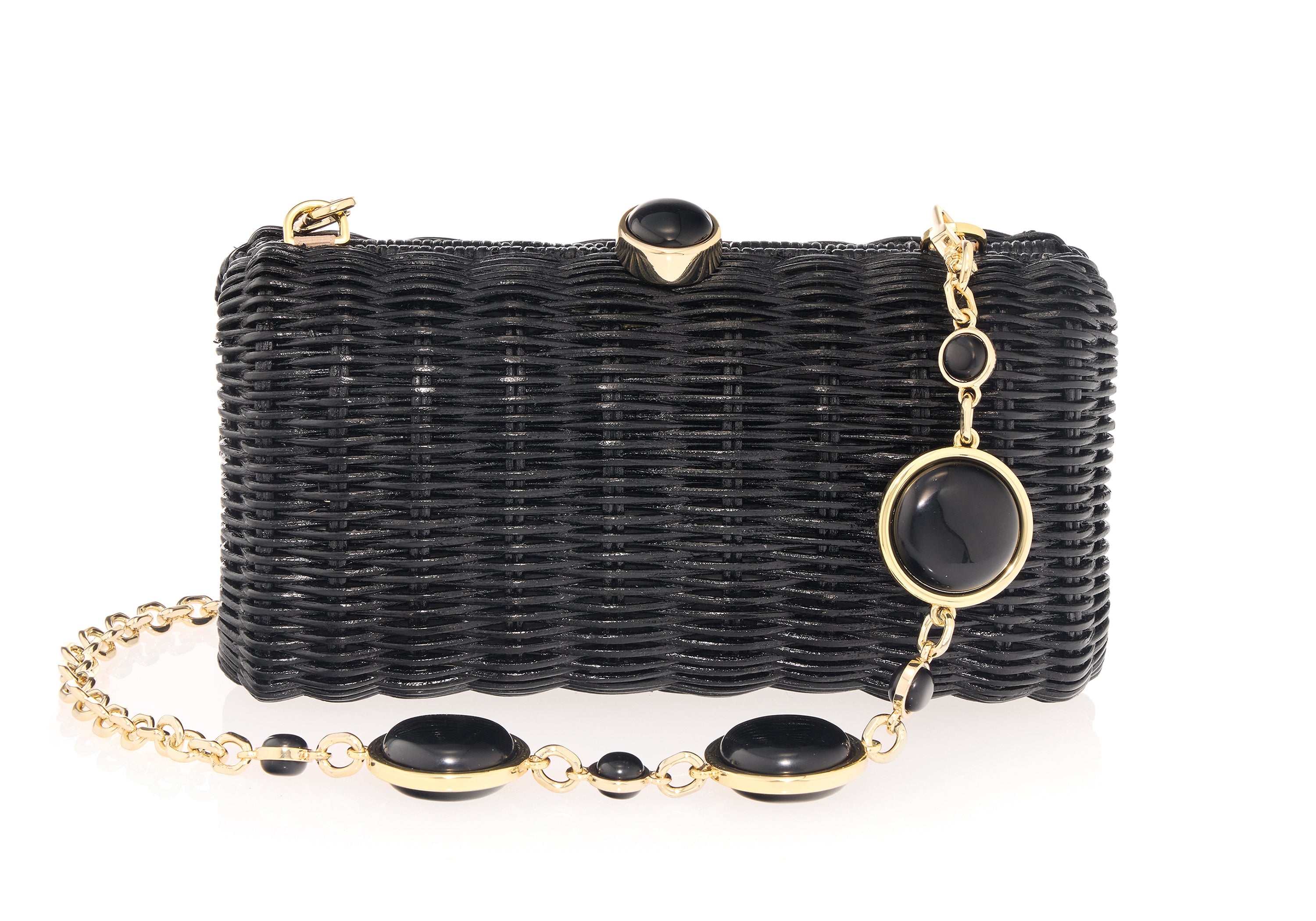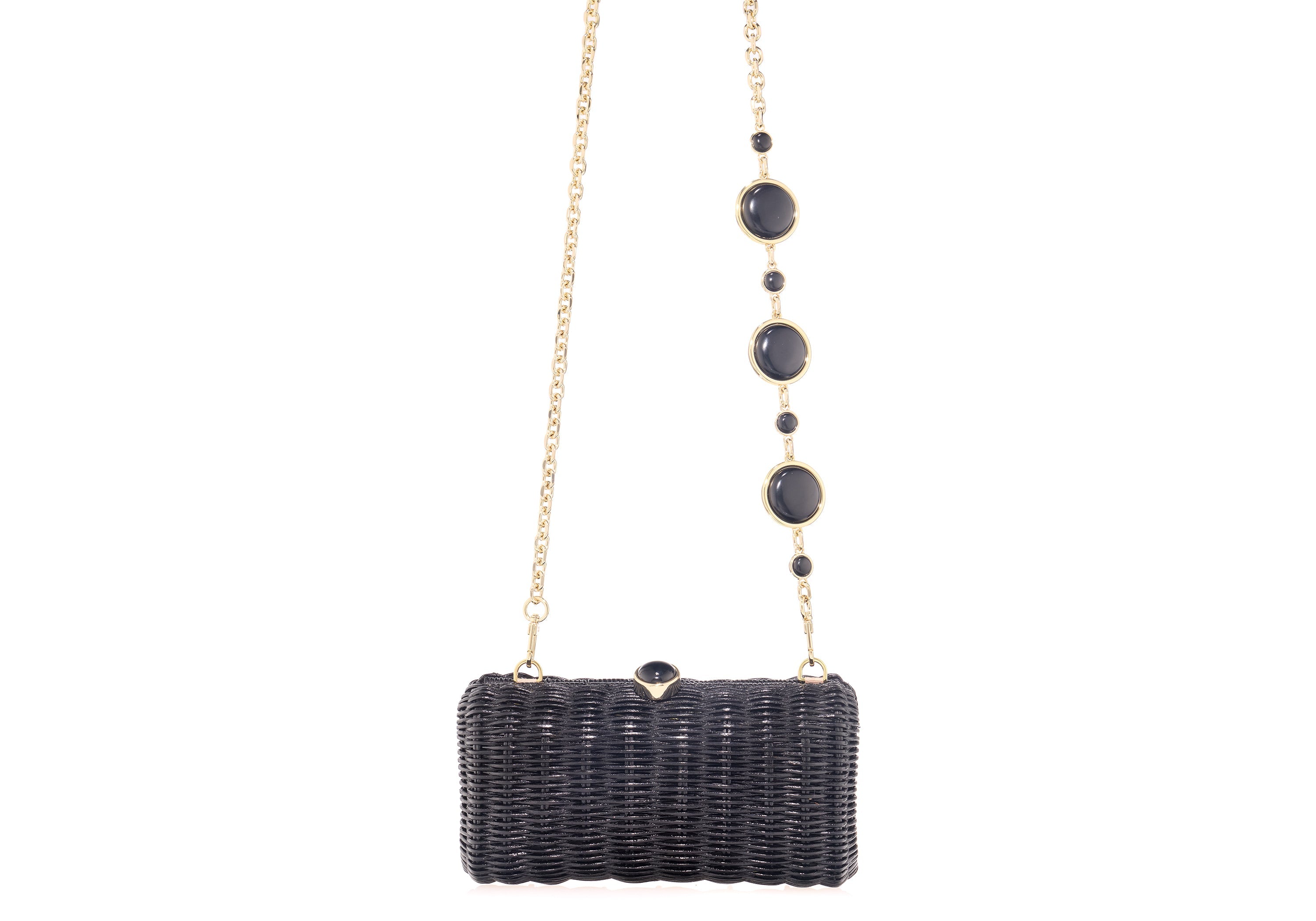 Elevate your look with the sleek Poppy Basket, a chic rectangular East-West black wicker handbag crafted for timeless style and practical capacity. Featuring an asymmetrical gold chain adorned with bold onyx stones, this striking detail pairs beautifully with a matching onyx stone closure. Combining classic artistry with modern accents, this versatile handbag is a sophisticated statement piece for any occasion.