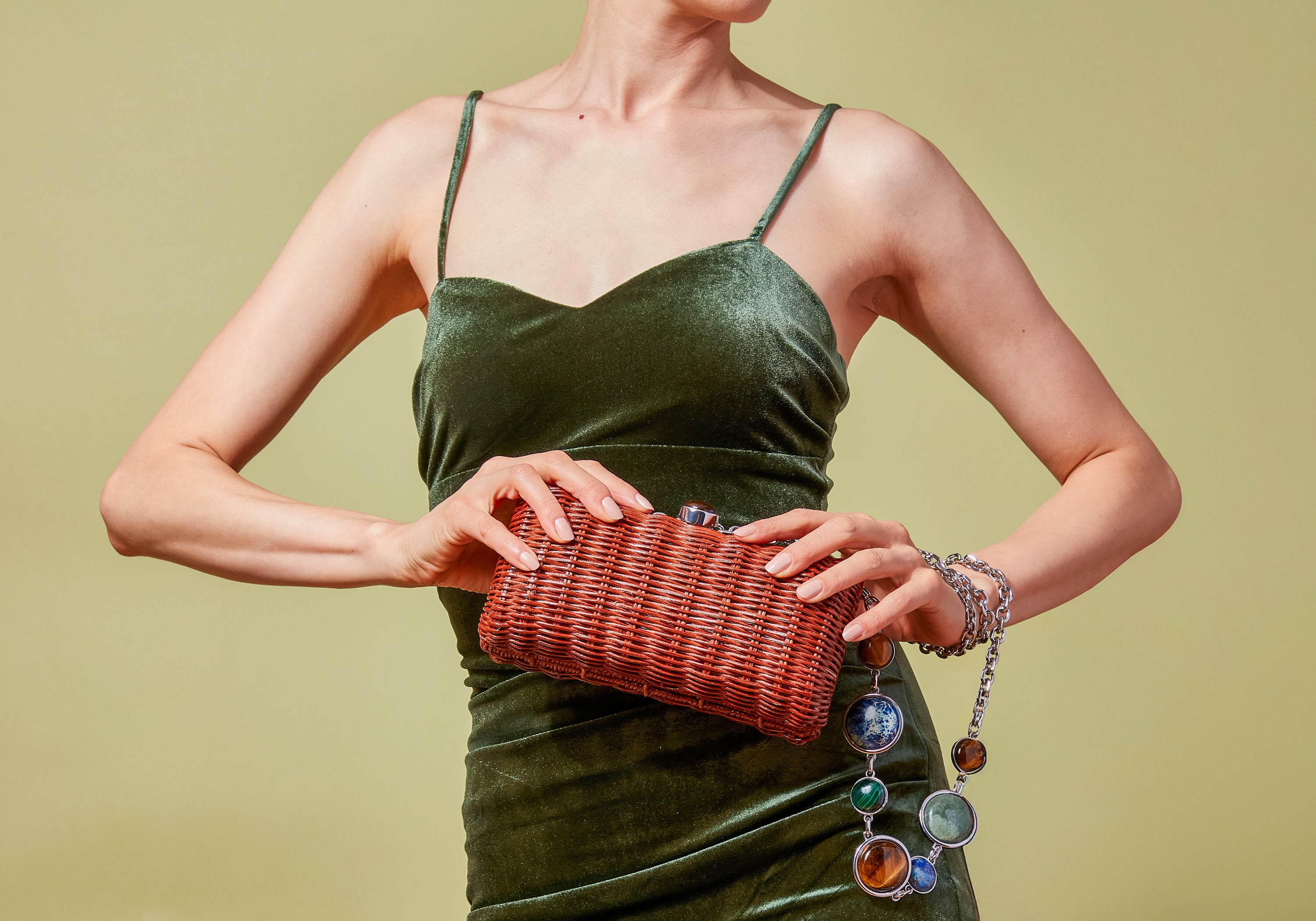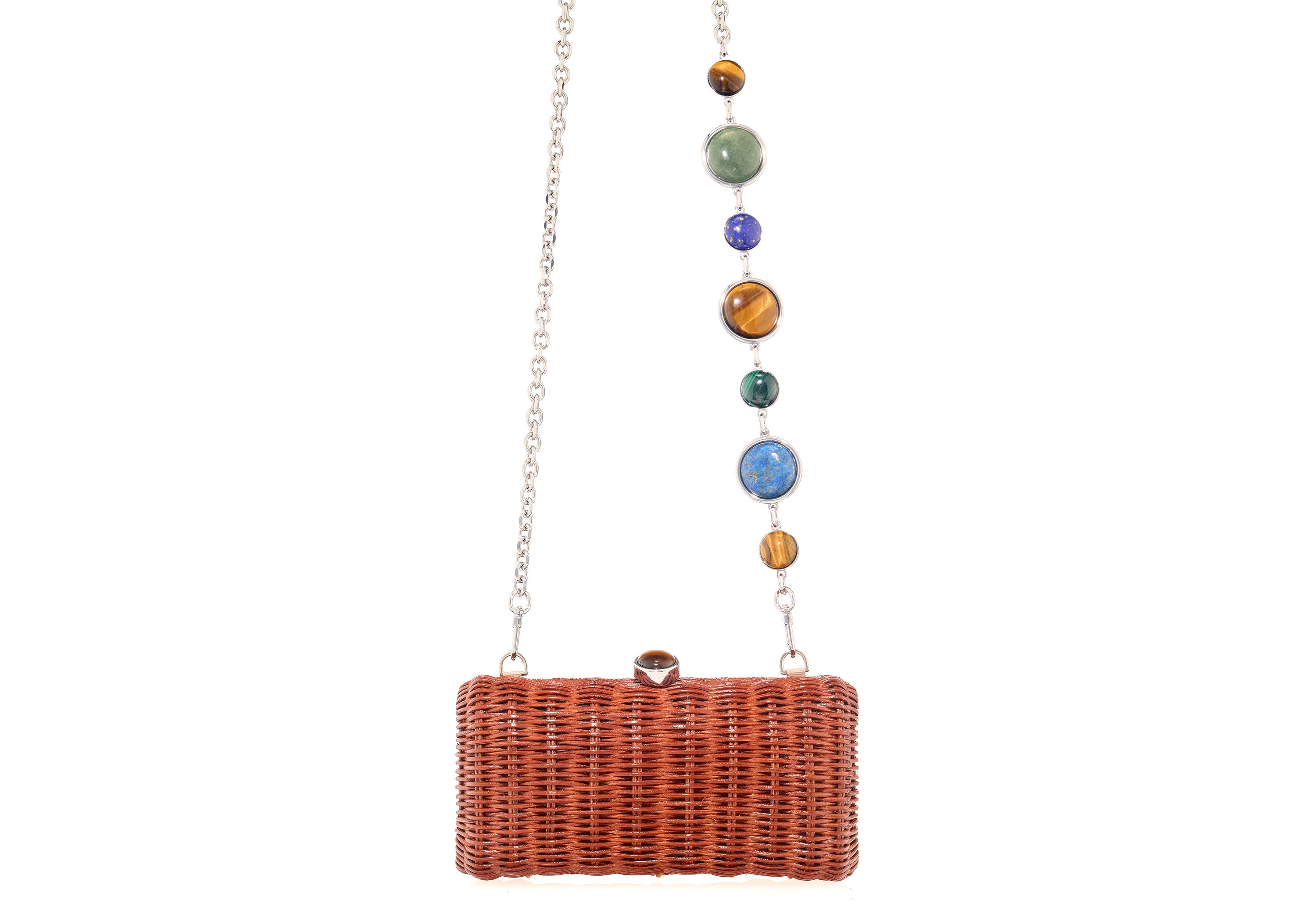 Experience effortless elegance with the Poppy Basket in a rich bronze-glazed brown wicker. This rectangular East-West handbag features a polished finish that balances classic craftsmanship with modern style. Its asymmetrical chain is adorned with semi-precious stones including Malachite, Tiger’s Eye, and Sodalite, creating a distinctive and artistic accent. Designed to fit essentials comfortably, this handbag combines practical capacity with luxurious details, making it an ideal accessory for day or night.