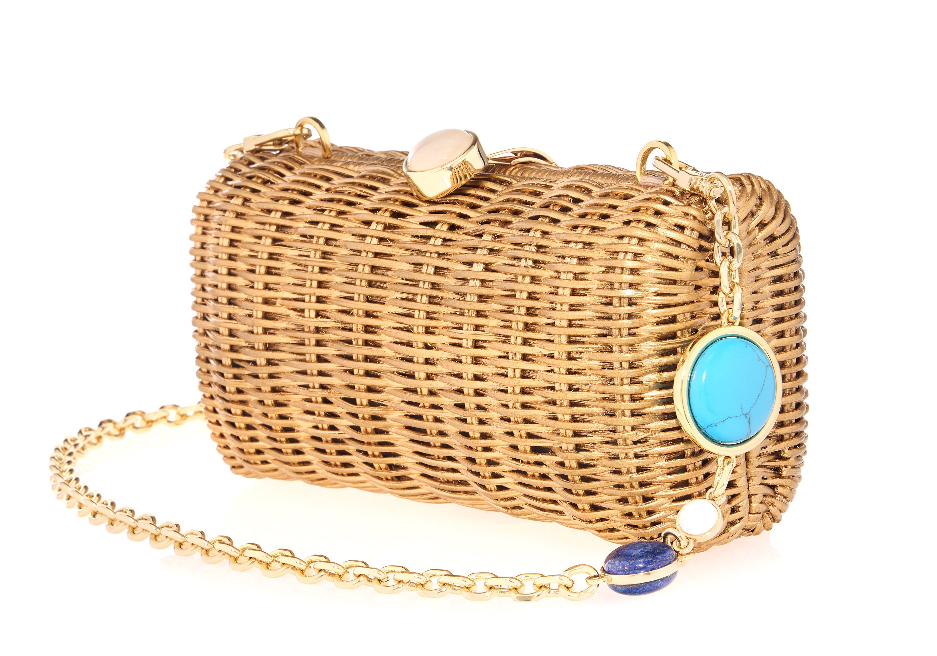Shine with the metallic gold Poppy Basket, a rectangular East-West wicker handbag designed for enduring elegance and ample capacity. Its unique chain showcases stunning Rock Crystal Quartz, Turquoise, and Lapis semi-precious cabochon settings, adding vibrant color and luxurious texture. This luminous handbag’s timeless design elevates any outfit with effortless sophistication.