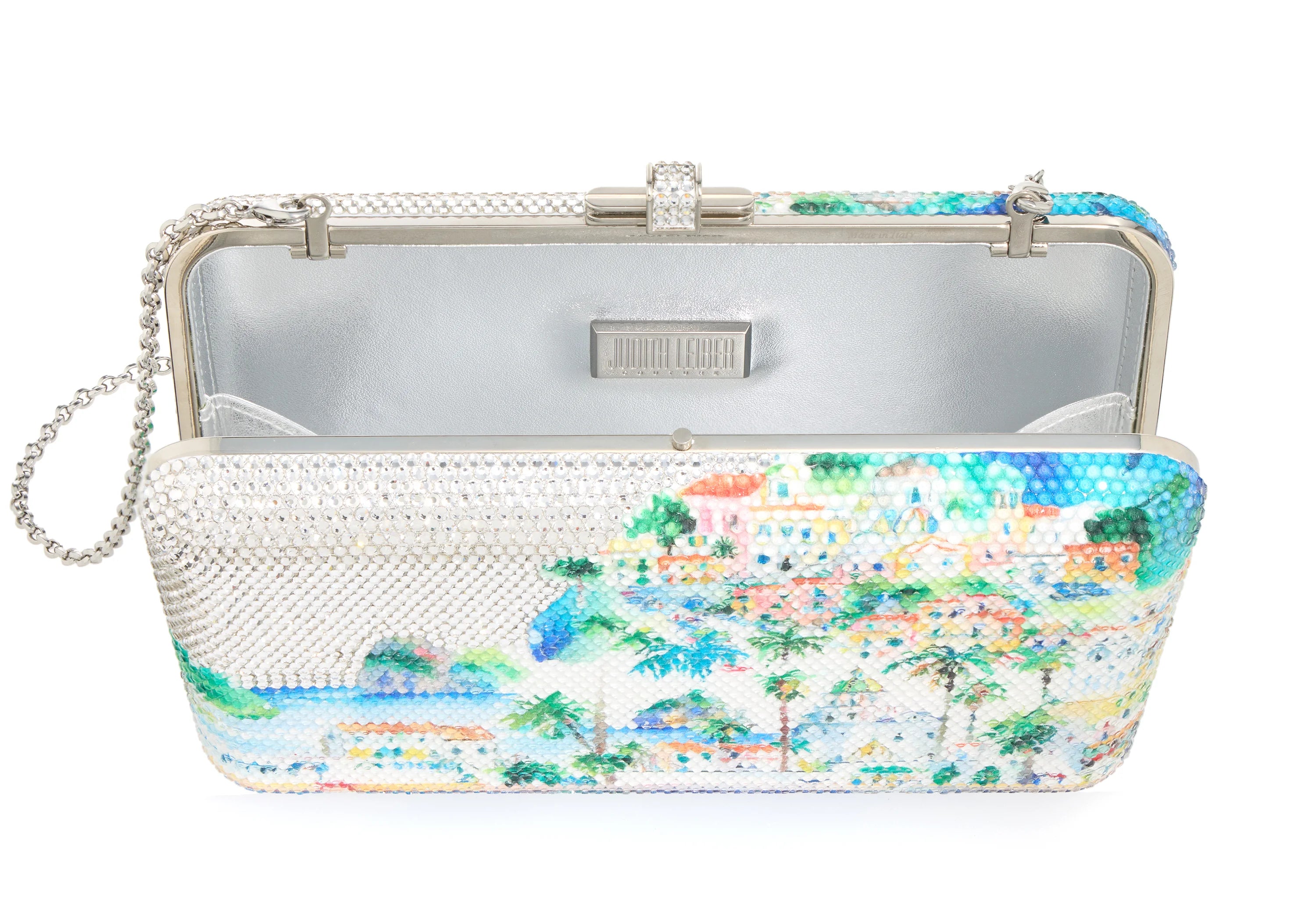 Capture the Italian coastline in one beautiful piece of art with our Slim Slide Costa crystal clutch. With a beautiful watercolor painted pattern of a picturesque scene on the cliffs of Amalfi with a clear crystal overlay, this bag embodies the charm of a small town with the beauty of its easy lifestyle. Perfect for your next European getaway, this bag tells its own story.