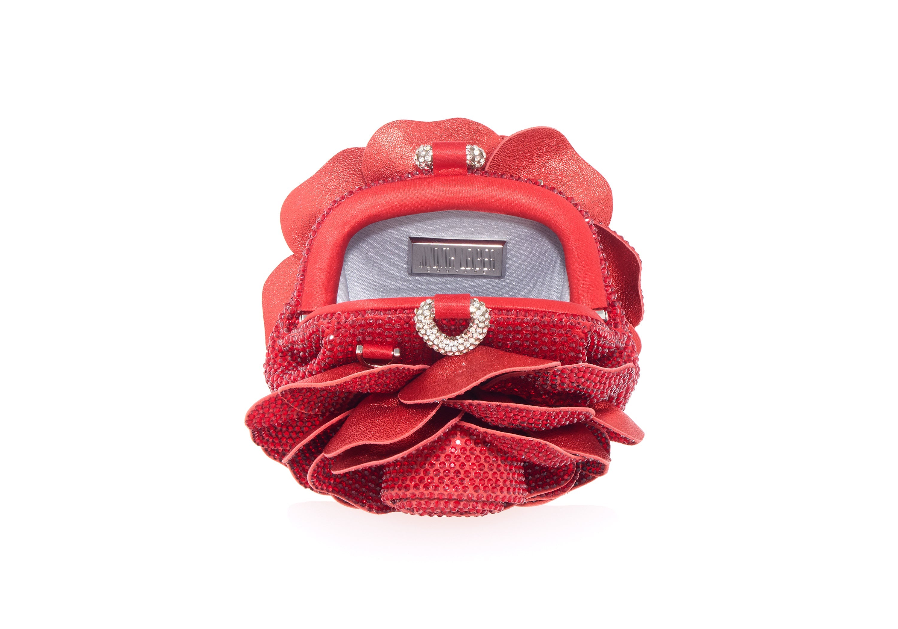 Delicate and captivating, this Soft Rose Belle handbag is artfully shaped like a delicate red rose, crafted from soft crystal petals and tumbled leather. The hand-gathered and spiraled detailing on both the front and back creates an elegant, dimensional silhouette that mimics a blooming flower. Finished with a jeweled shoulder chain, this exquisite design combines luxurious materials with masterful craftsmanship, making it a graceful statement piece for any occasion.