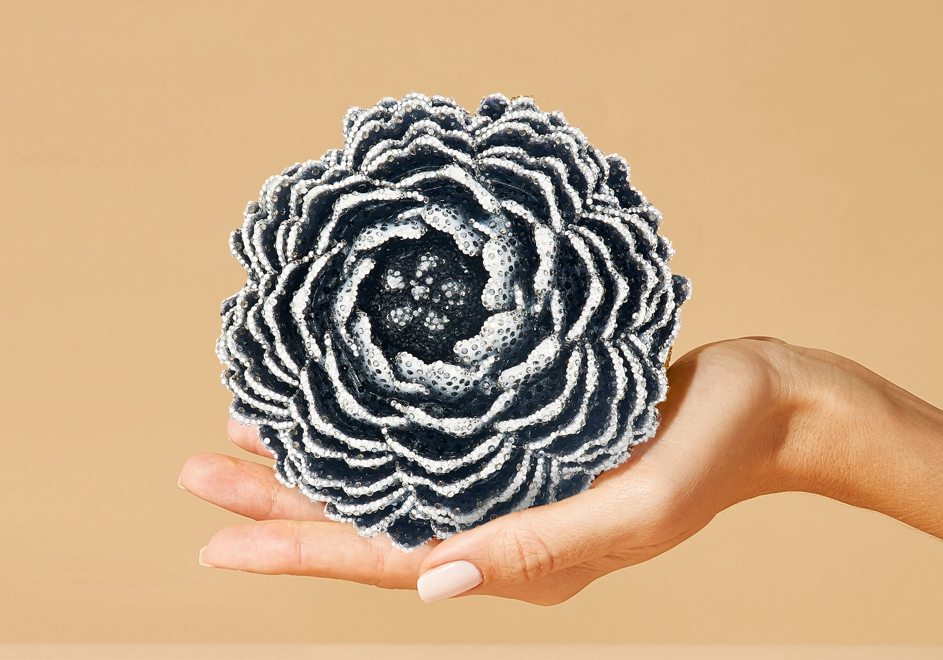 Experience the elegance of the Peony Moonbeam clutch. Crafted with jet crystal and a tiered petal shape, it makes a stunning statement for any high-end event. Glittering and luxurious, it adds a touch of dramatic glamour to any outfit.