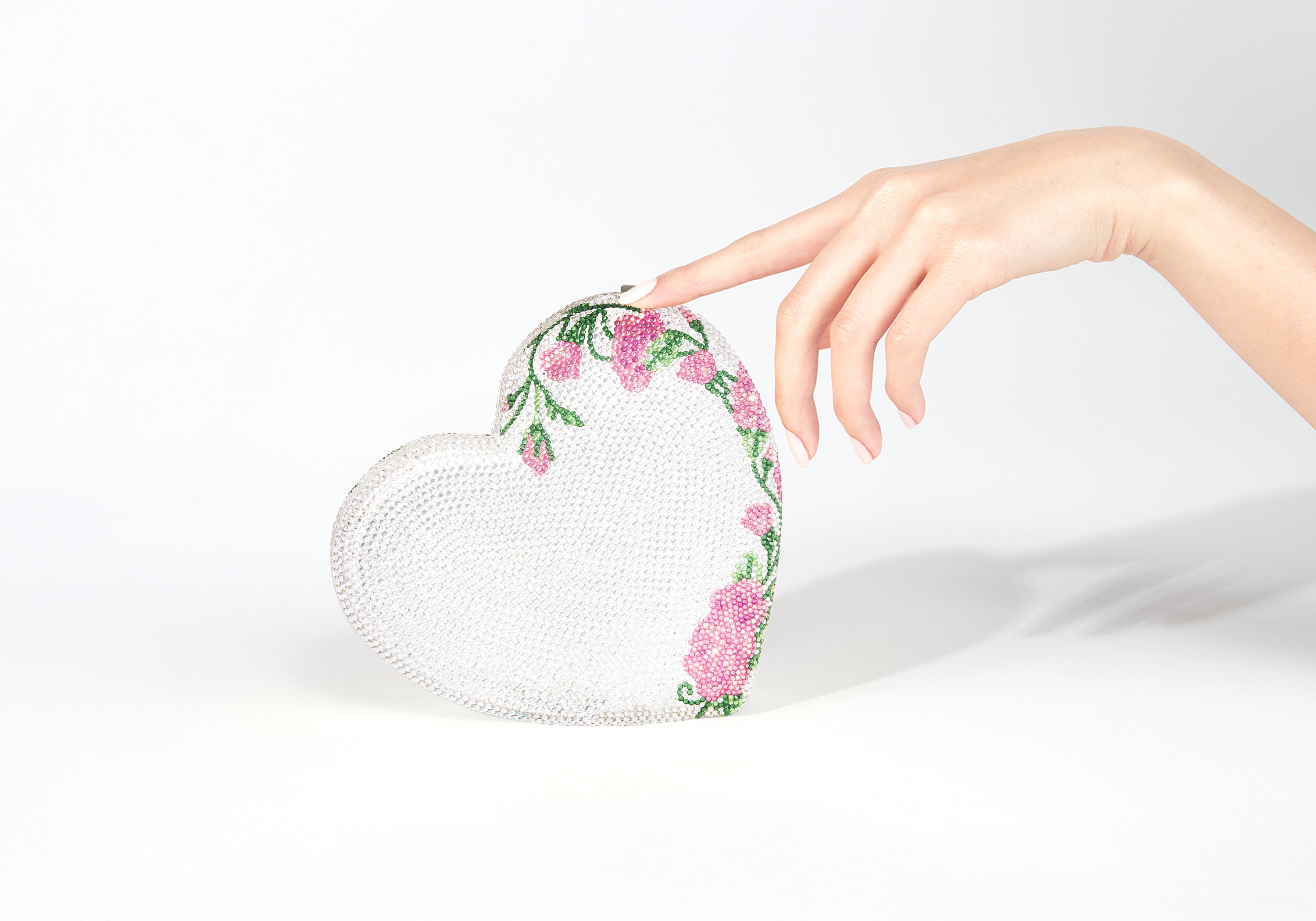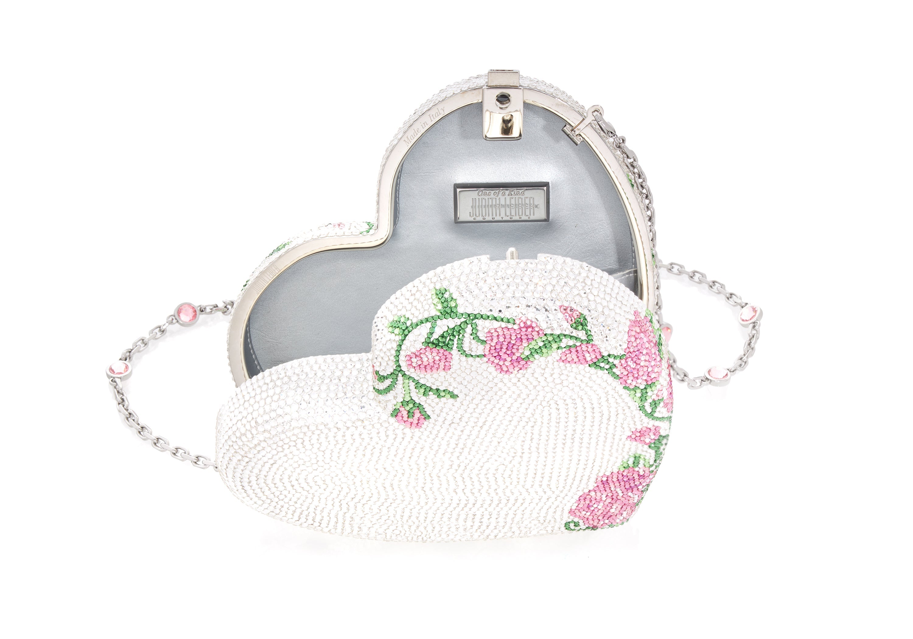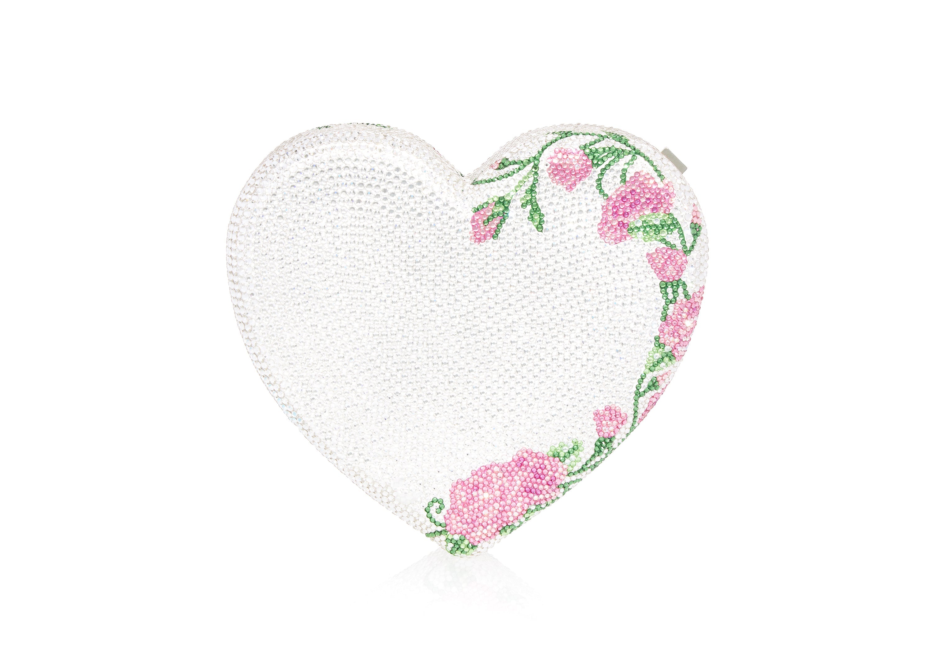 The heart wants what it wants. Fall in love with this romantic heart handbag with a rose vine pattern along the edge. The rose pattern falls gently down the side of the silver crystal covered heart in pink petals on a delicate, intertwining green vine.