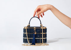 Our oval shaped Willow Basket handbag, crafted to resemble a basket with navy woven crystal intricately laced through gold hardware. The crystal top, adorned flaps down with a latch closure and features a silk tassel with a JL medallion. Finished with a leather top handle, this bag ensures both style and comfort.
