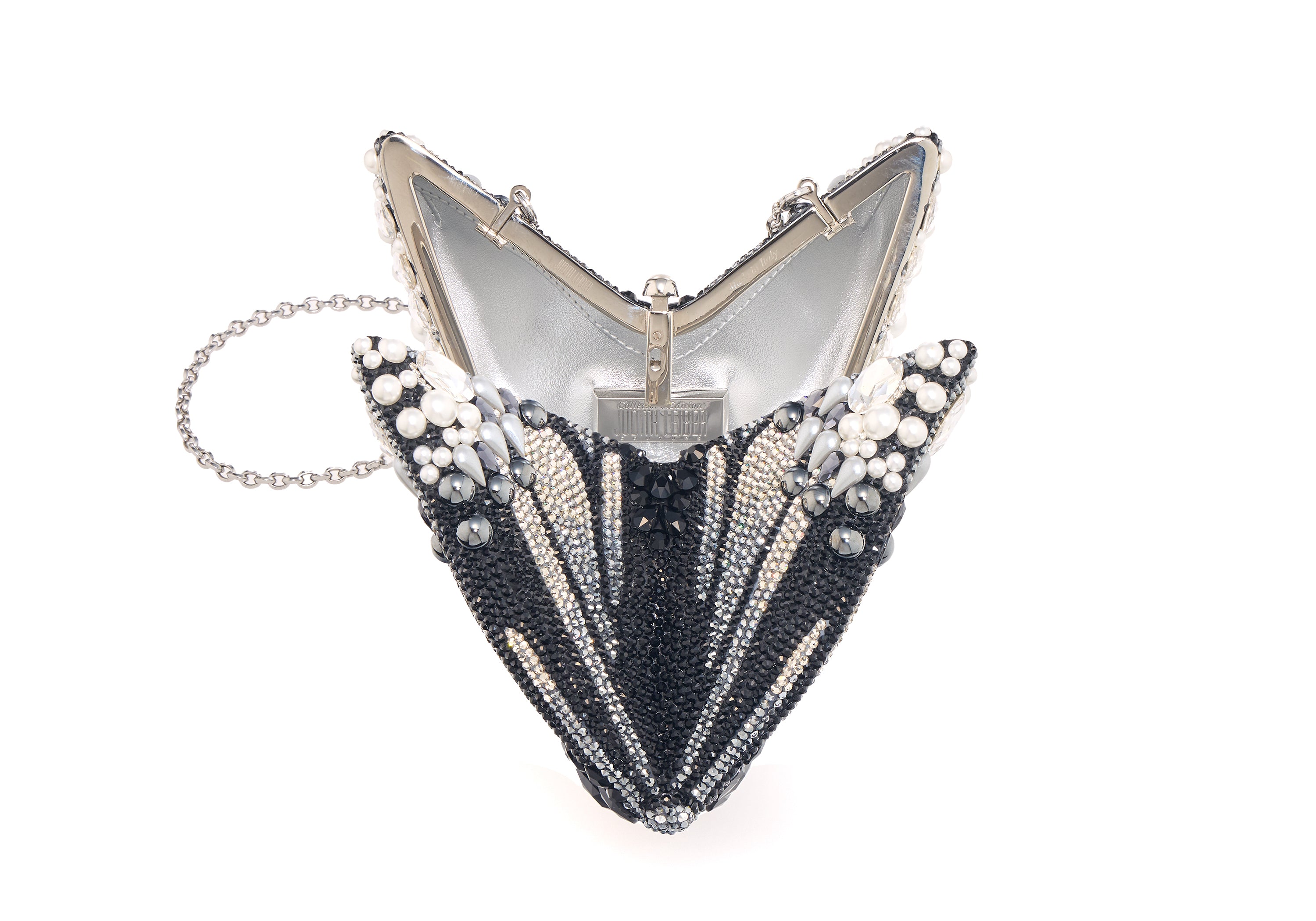 Graceful yet bold, this Colette Butterfly clutch is adorned with black and white crystals, lustrous pearls, and radiant oversized stones. A true work of luxury craftsmanship, it transforms a timeless motif into an accessory of couture-level brilliance.