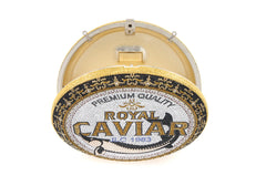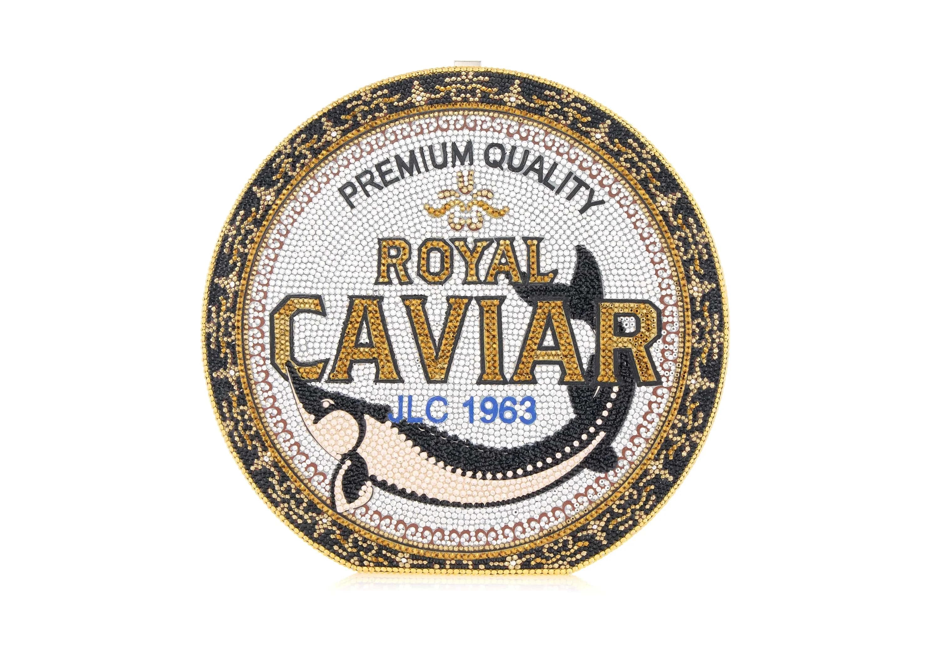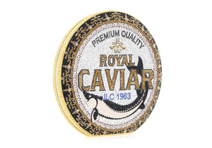 Indulge in luxury with our Royal Caviar crystal clutch, designed in the shape of an elegant round caviar tin. Adorned with a luxurious blend of silver, black, and gold crystals, this stunning piece evokes the opulence of the finest caviar. The shimmering crystals highlight the sophistication and exclusivity of this unique accessory. Perfect for festive dinners and adding a touch of royal flair to any evening look, this handbag makes a fun but refined statement.