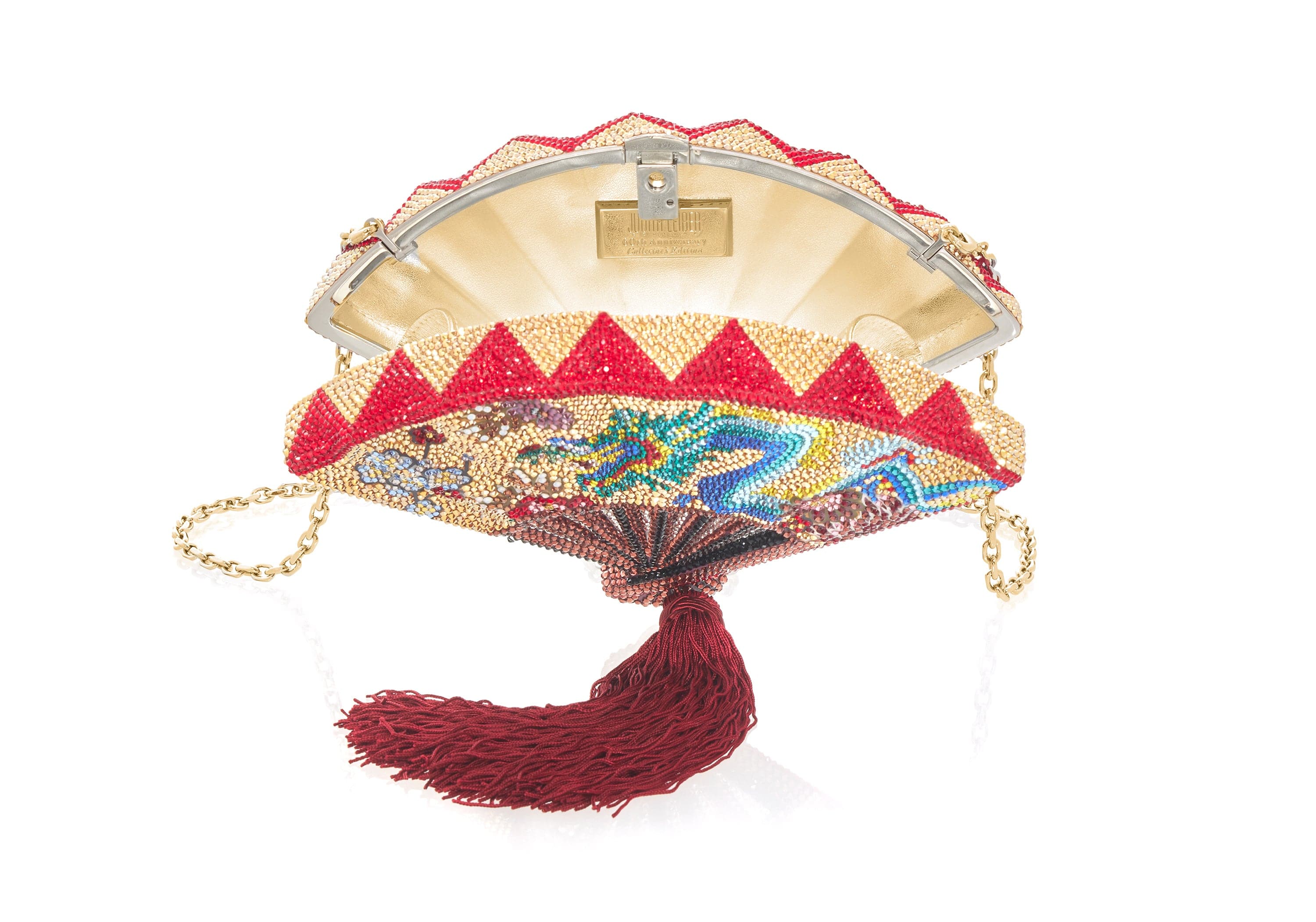 Celebrate a year of good fortune by indulging in a fiery floral patterned crystal dragon fan. The feminine flower motifs are met with a strong, colorful dragon against hues of gold, representing aspects of growth and strength together. The maroon silk tassel is the perfect finishing touch for classic elegance.