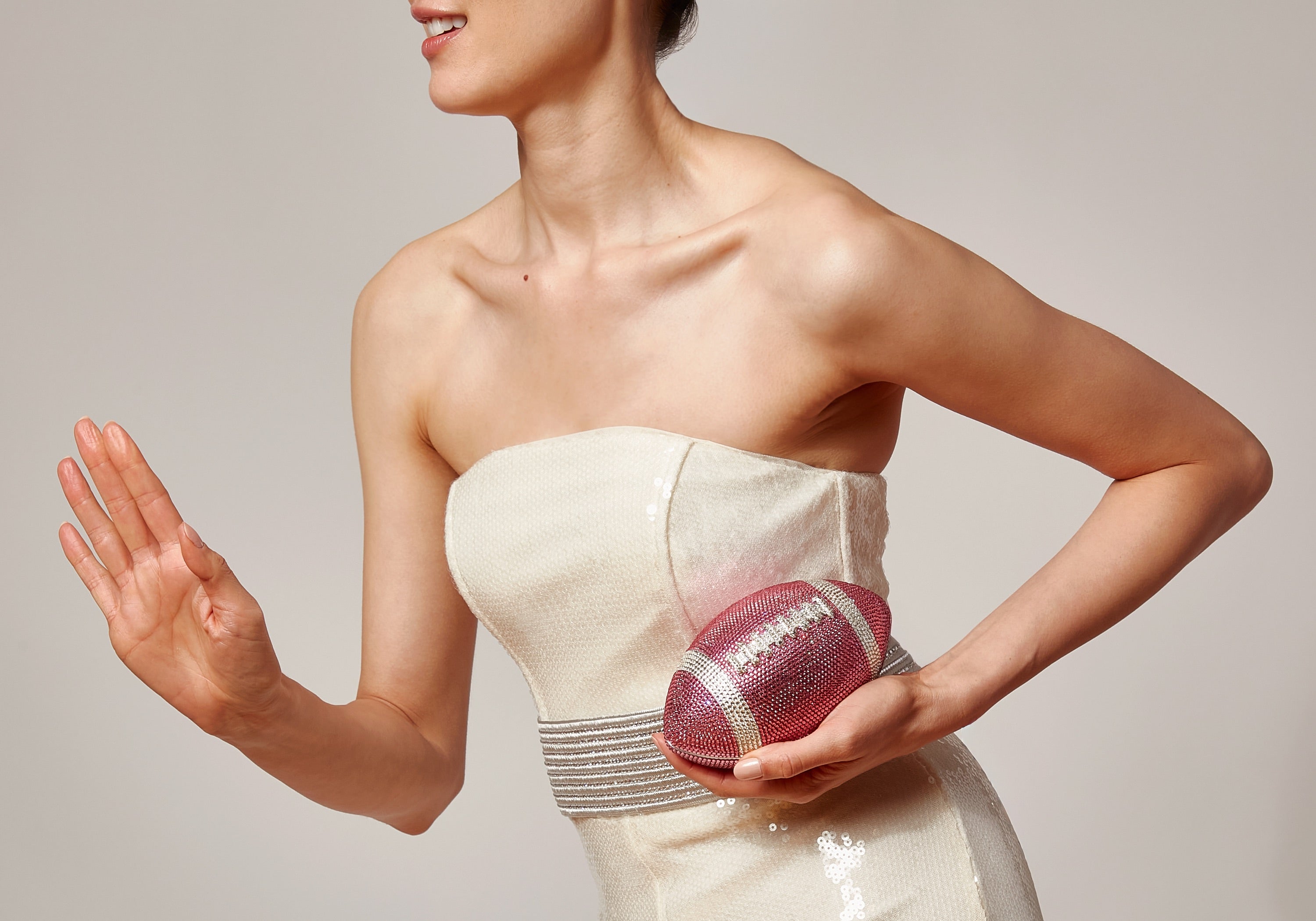 Score major style points with our pink Football crystal clutch, where sporty charm meets sparkling elegance. This whimsical accessory is a touchdown of fashion fun, featuring intricate crystal detailing that mirrors the beloved shape of a football. Whether you're a trendsetting quarterback or simply a fashion enthusiast looking to add a playful twist to your look.