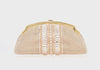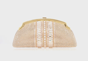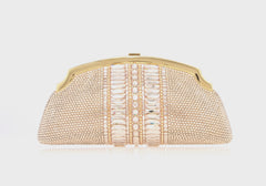 Our Mini Venetian Gems clutch is a compact yet striking accessory that brings a fresh take on classic elegance. Covered in sparkling champagne crystals, this evening bag is defined by its unique shape and refined structure. The baguette crystal band down the center adds a sophisticated touch, giving this bag a timeless appeal. Perfect for evening soirées, cocktail parties, or upscale gatherings, this bag effortlessly complements any glamorous look.