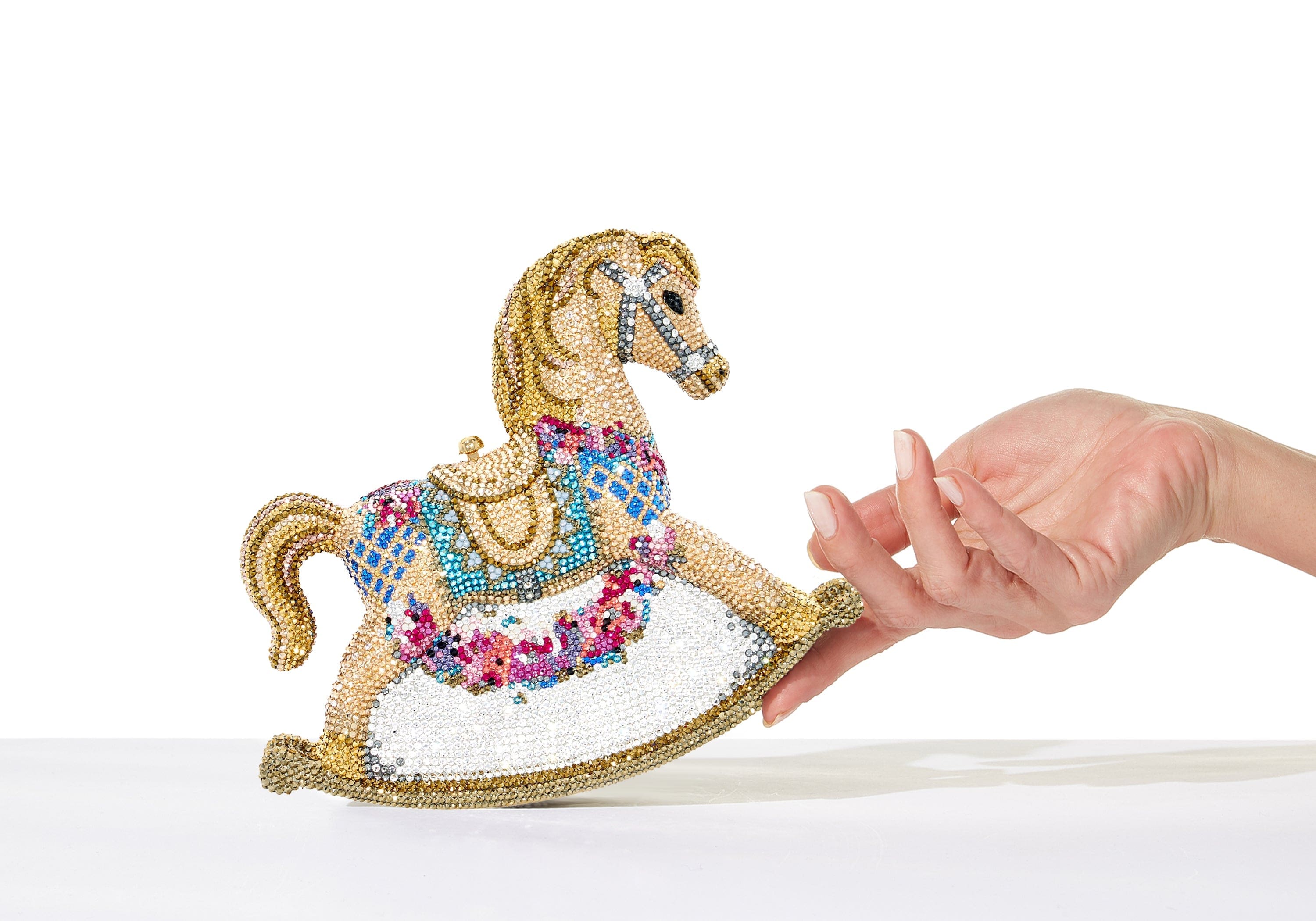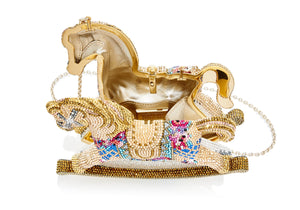 Delight your inner child with our magical rocking horse Penelope. Her attention to detail and colors were inspired by a vintage carousel. Her golden tones are highlighted by soft shades of blue, rose and white.