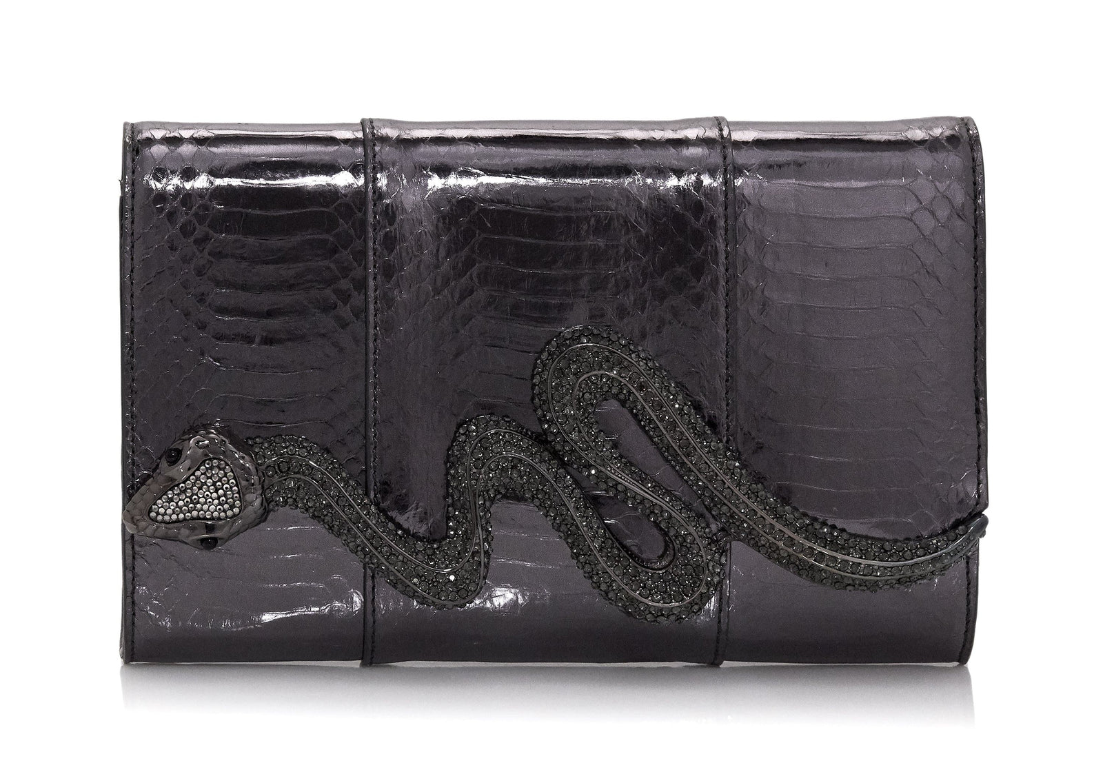 A bold serpent ornament is the centerpiece of our Serpent Snakeskin Clutch in a deep emerald color and makes it the epitome of the elegant and the exotic. This clutch has a unique bite - you'll be sure to stand out at any event.