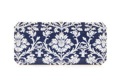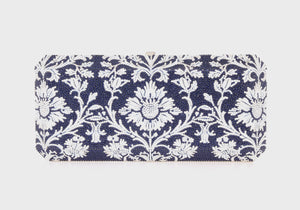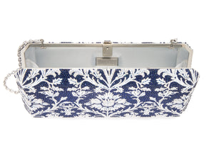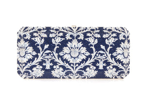 Elevate your evening look with our Slim Rectangle Trellis. A stunning accessory that combines intricate craftsmanship with timeless elegance. The delicate floral pattern and fine linework, crafted in white opal crystals, contrast beautifully against a rich dark indigo ground, creating a striking visual effect. Whether you're attending an upscale event or a glamorous night out. Its intricate design, paired with the refined crystal detailing, makes it a versatile piece that effortlessly complements a sleek gown or cocktail dress.
