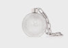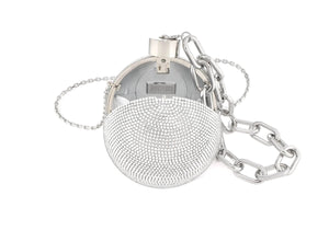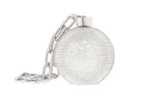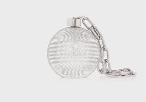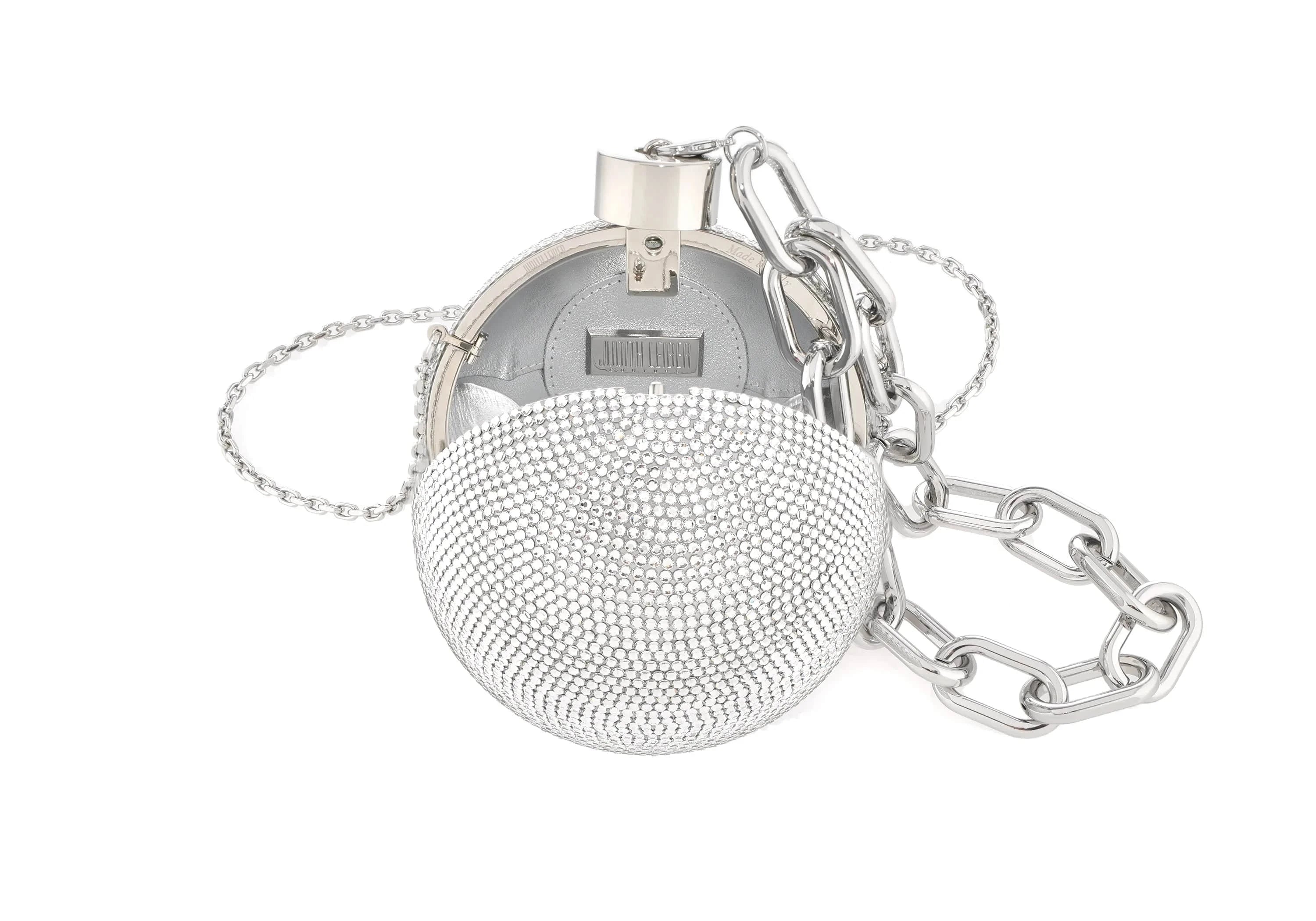 Make a shimmering statement with this Ball and Chain sphere novelty bag embellished with silver crystals. Complete with a unique chain link wristlet for convenient carrying.