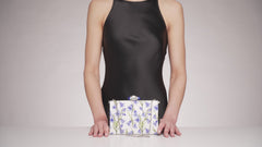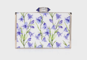 Texas’s state flower shines bright on this Tall Slender Rectangle Arabella crystal clutch in shades of blue with green watercolor painted vines.